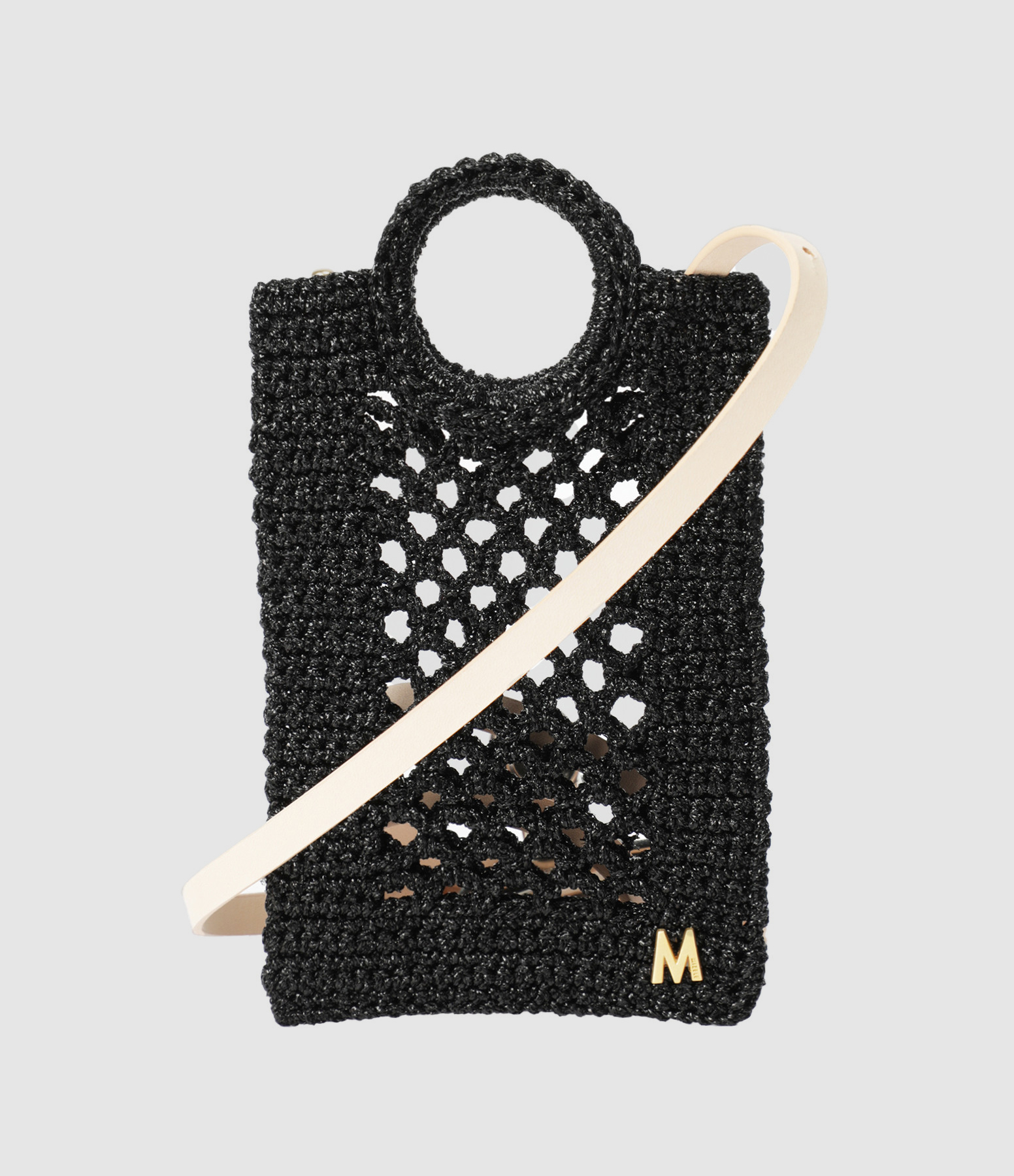Porte-téléphone en lurex noir pailleté ajouré. Une fine bandoulière en cuir beige amovible et réglable.