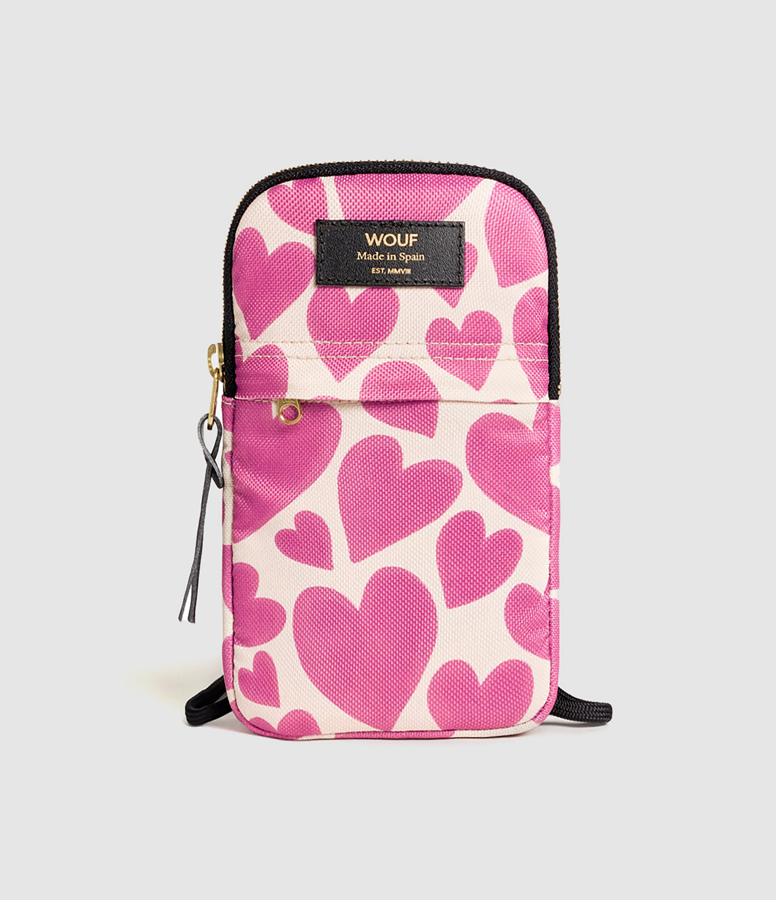 Porte-téléphone matelassé en tissu recyclé à imprimé cœur rose. Fermeture par zip. Poche plaquée à l'arrière. Cordon ajustable.