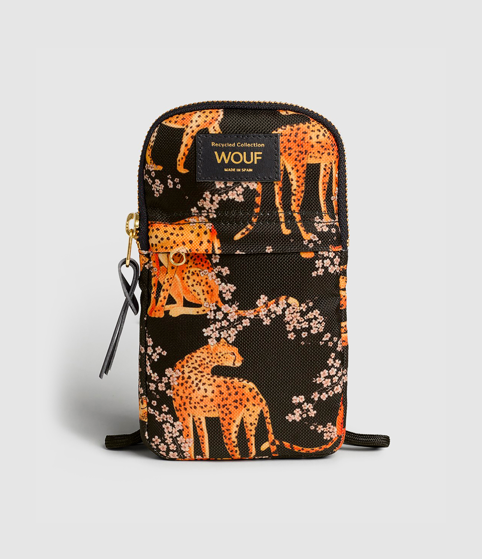 Porte-téléphone en tissu recyclé à imprimé tigre. Fermeture par zip. Poche zippée à l'avant. Cordon ajustable.
