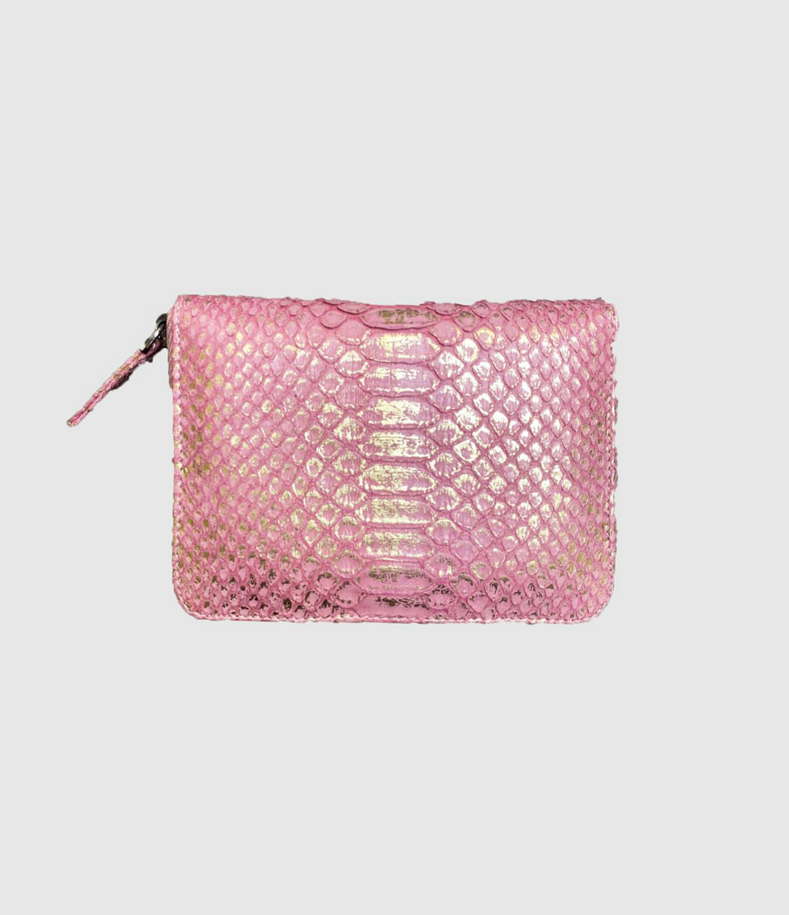 Portefeuille en python rose et doré. Double compartiment avec pochette zippée et porte carte. Zip de fermeture argenté.