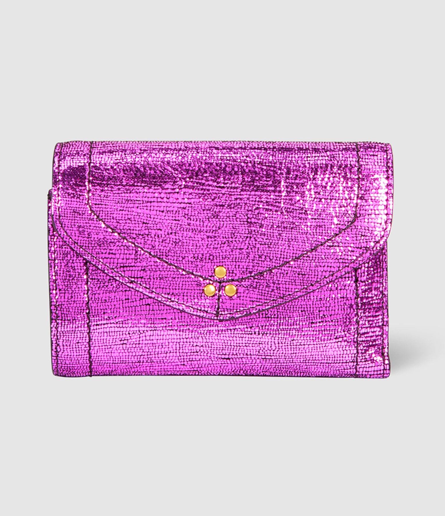 Portefeuille en cuir lamé fuschia. Fermeture à pression. Rivets argentés. Intérieur doublé en coton organisé avec un rangement monnaies zippé, un emplacement billets et sept emplacements cartes.