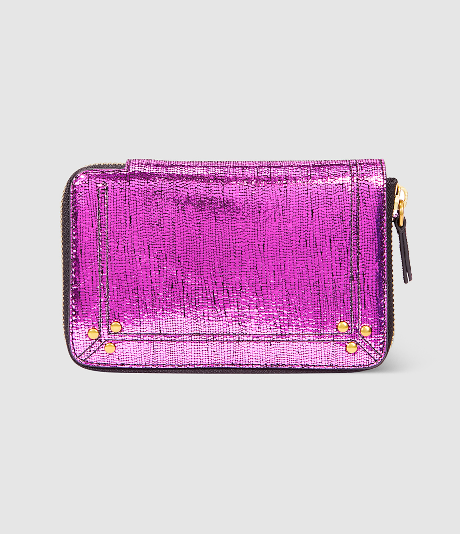 Portefeuille en cuir lamé fuschia. Intérieur doublé en coton organisé avec un compartiment monnaie zippé, un emplacement billets, sept emplacements cartes et quatre poches plaquées. Fermeture entièrement zippée.