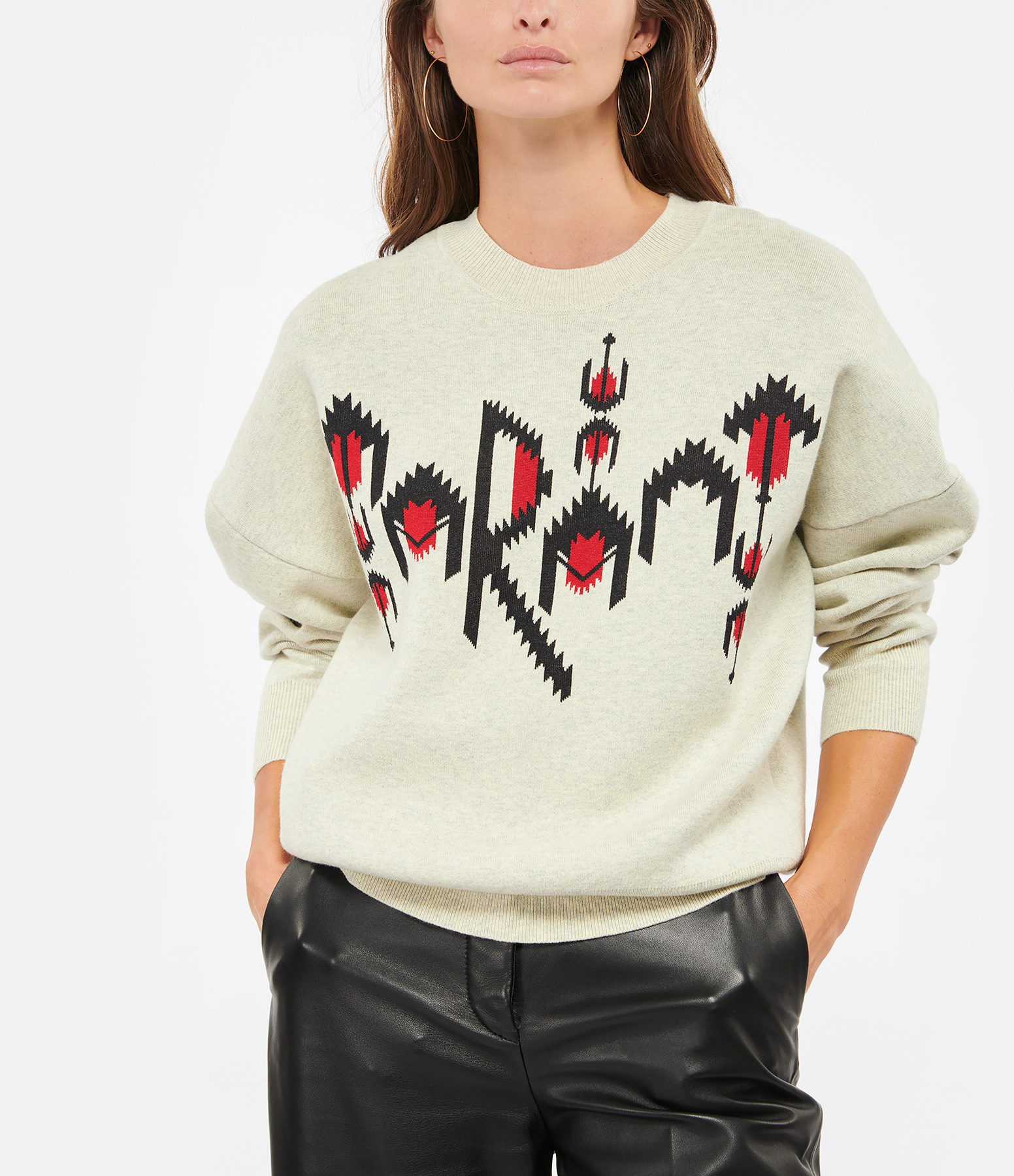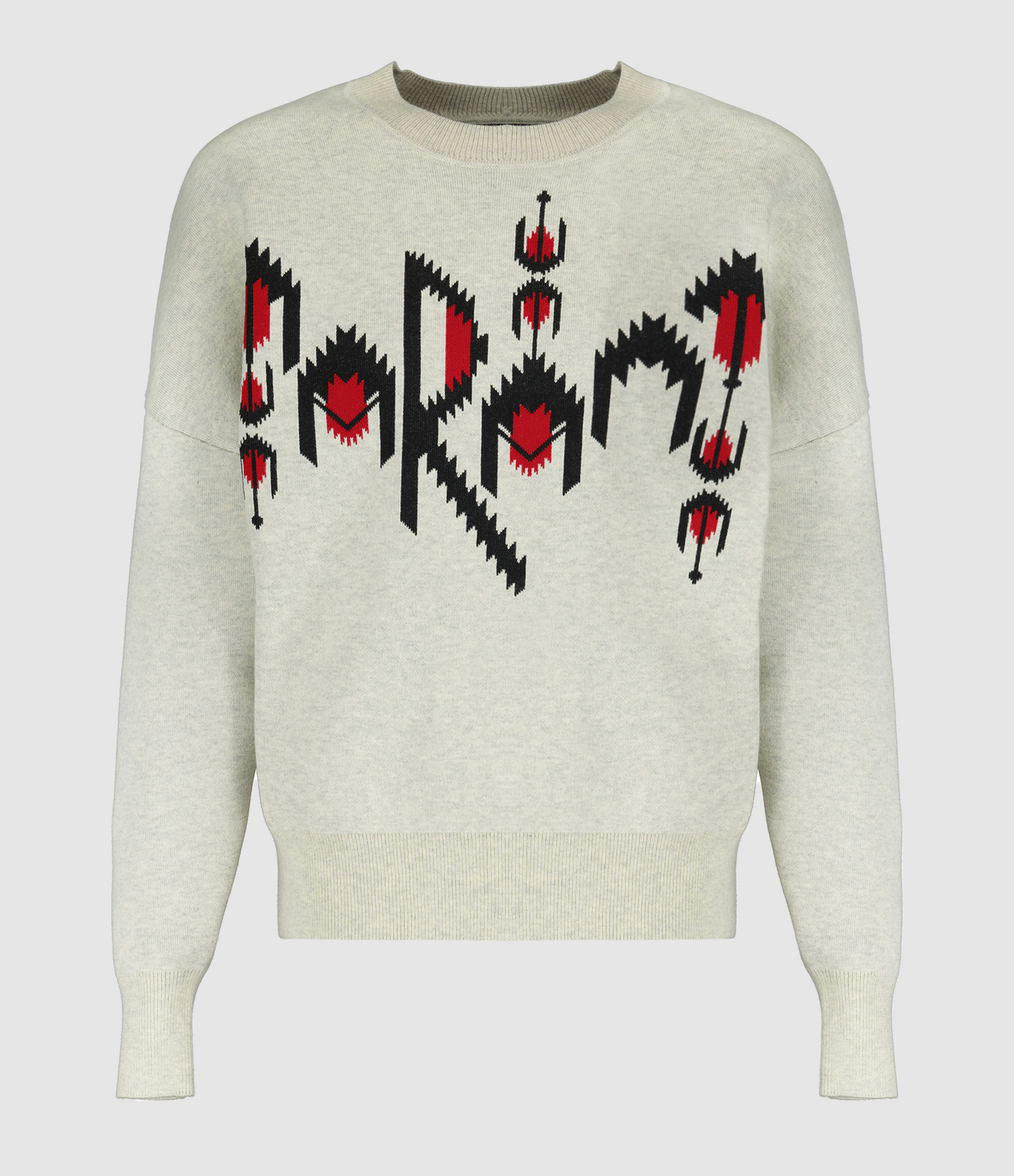 Pull en maille de coton mélangé gris chiné réhaussé de l'inscription "MARANT" en point de maille rouge et noir. Col rond côtelé. Manches longues avec poignets côtelés. Coupe ample. Base droite côtelé.