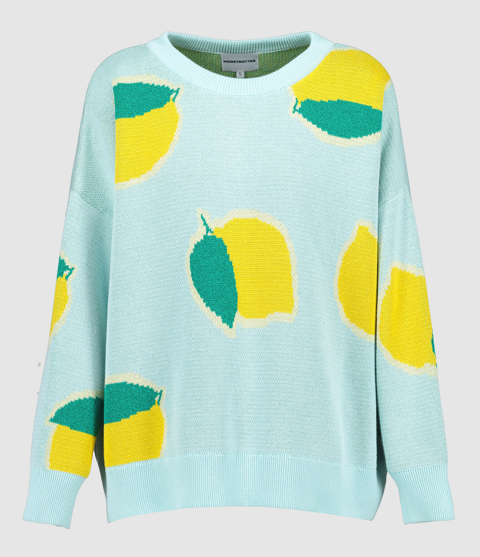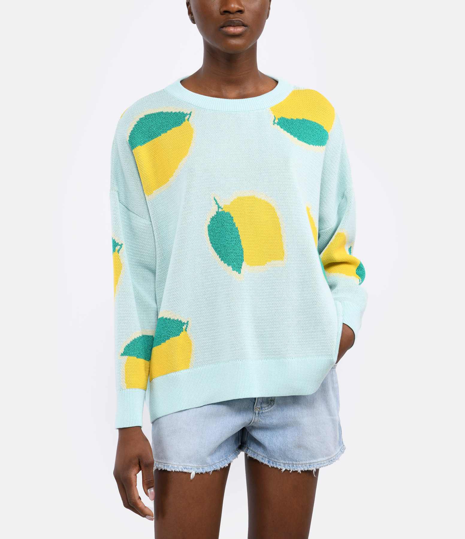 Pull en maille turquoise à imprimé citron jaune. Col rond côtelé. Manches longues. Coupe droite. Base droite côtelée.