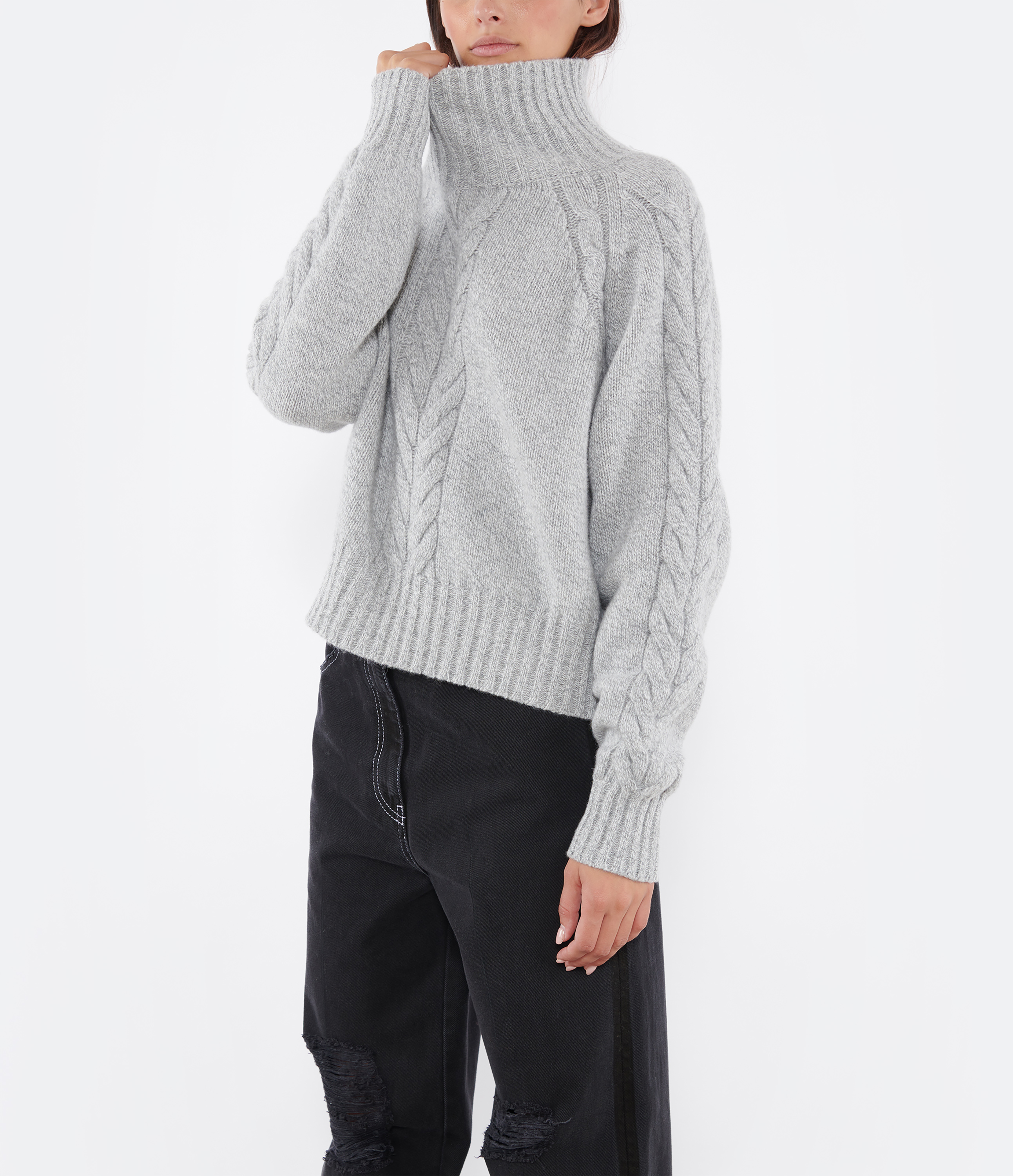 Pull en mérinos et cachemire gris clair. Détails en maille torsadée. Col montant. Manches longues resserrées aux poignets. Coupe droite. Base droite. Bords côtelés.