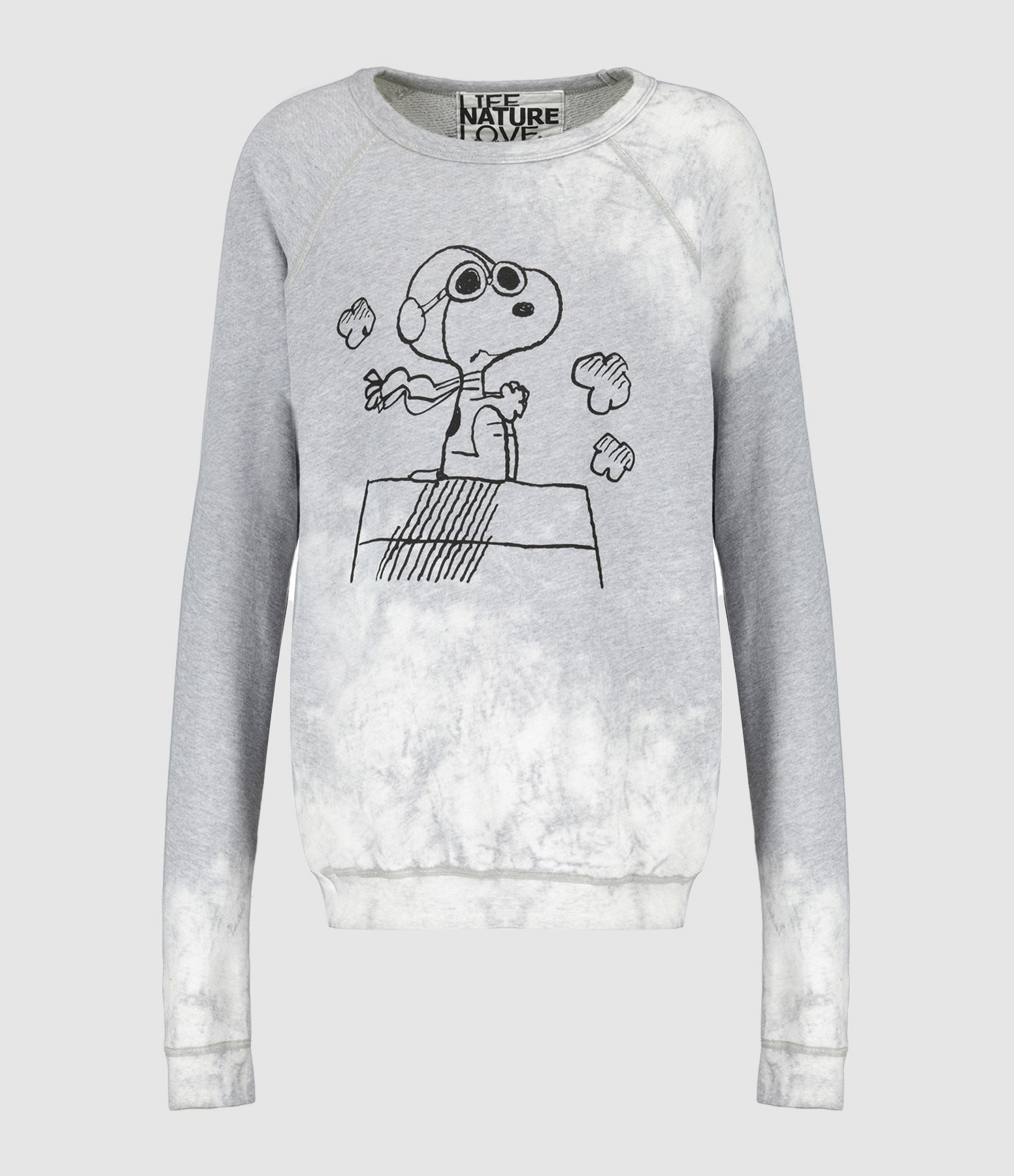 Pull en coton gris délavé. Personnage Snoopy sérigraphié sur le devant en noir. Inscription "BASIC GOODNESS" sérigraphiée à l'arrière en noir et rouge. Col rond. Manches raglans. Coupe droite. Base droite.