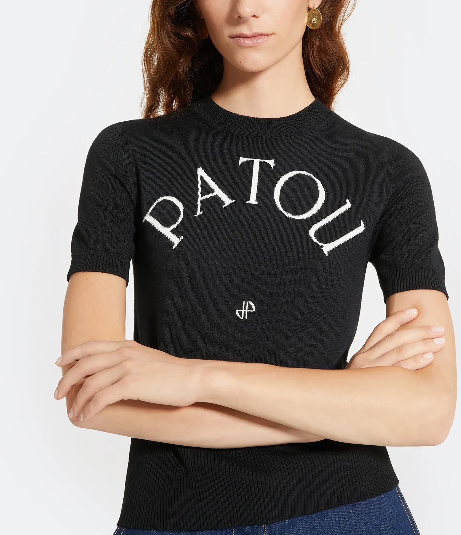 Pull en maille noir. Logo PATOU blanc sur la poitrine. Col rond. Manches courtes. Coupe droite. Base droite. Bords côtelés.