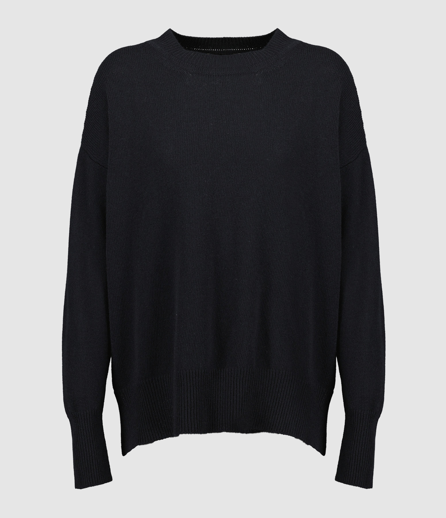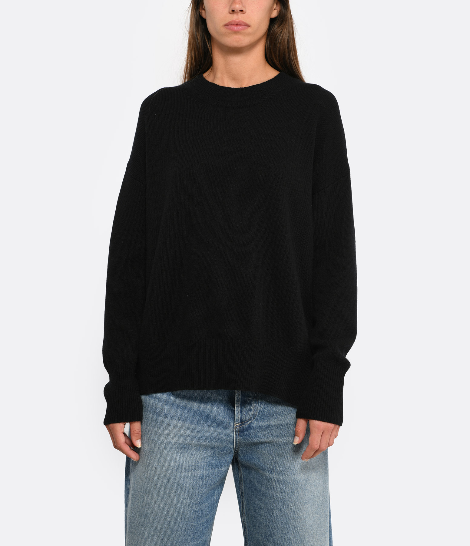 Pull en laine et cachemire noir. Col rond côtelé. Manches longues côtelées aux poignets. Coupe droite. Base droite plus longue à l'arrière.