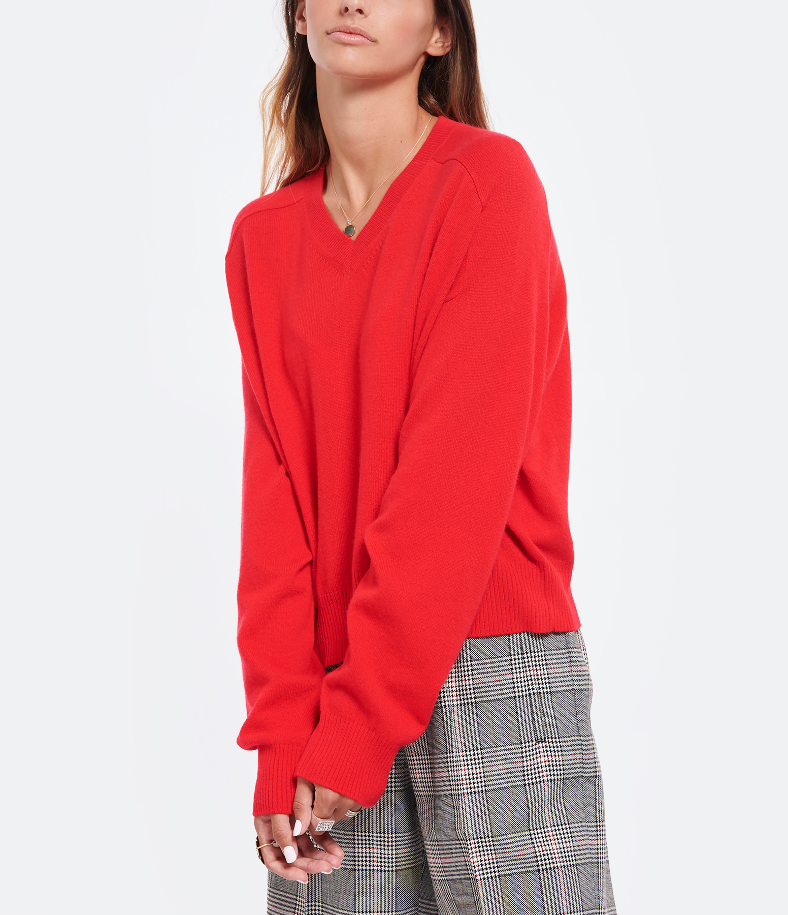 Pull en cachemire rouge. Col en V côtelé. Manches longues raglan avec poignets côtelés. Coupe droite large. Base droite côtelée.