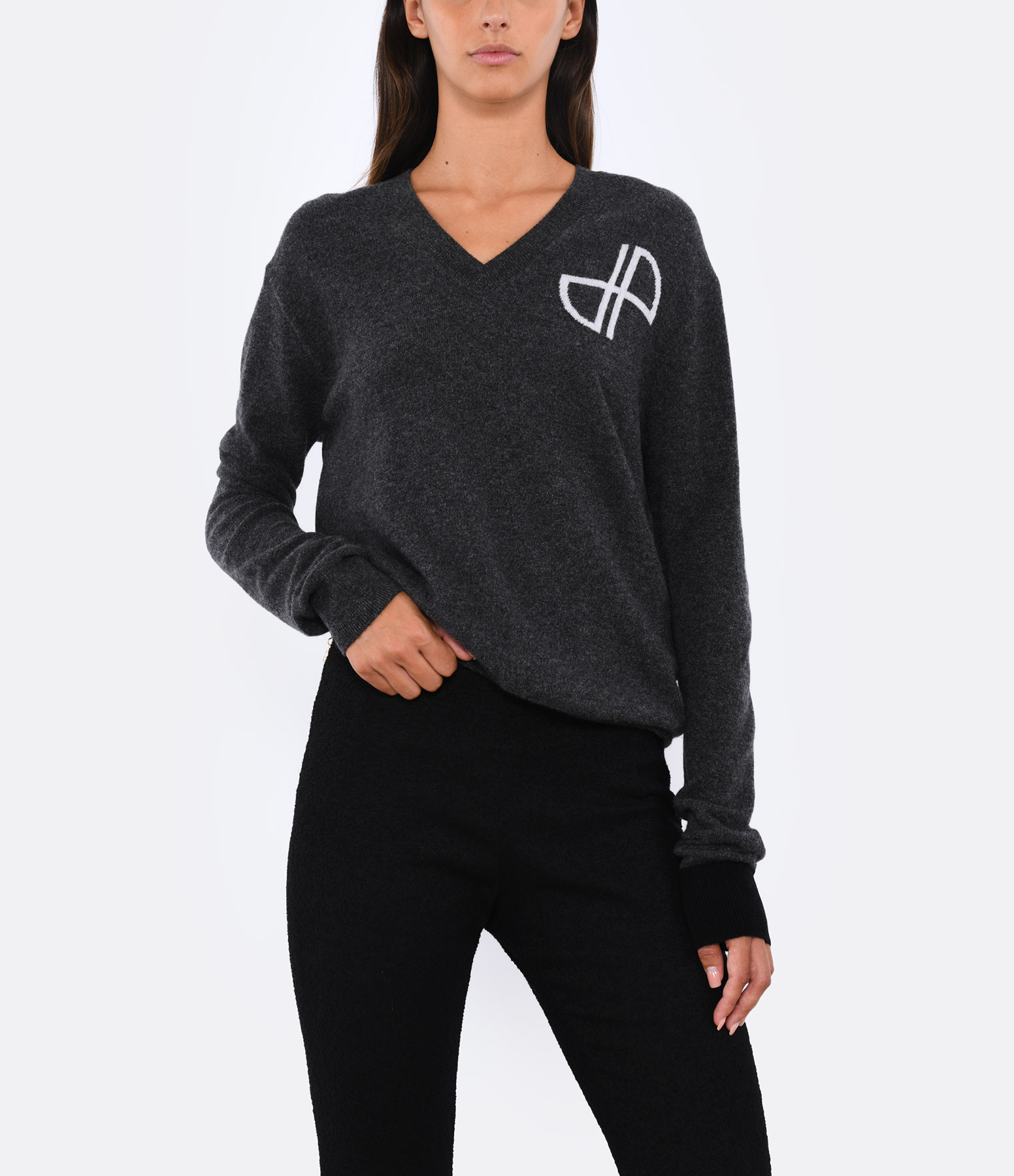 Pull en mérinos et cachemire gris. Col V. Logo de la marque blanc sur la poitrine. Manches longues avec poignets noirs. Coupe droite. Base droite. Bords côtelés.