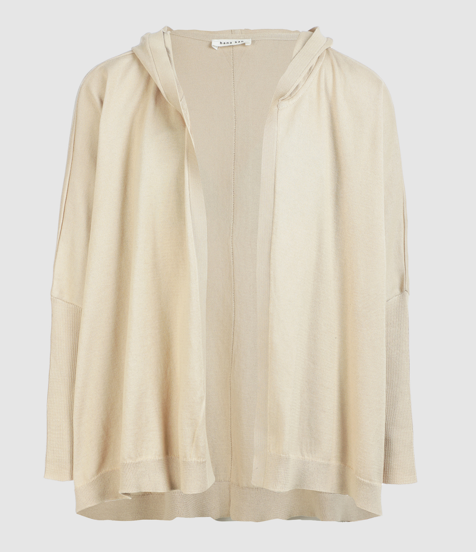 Gilet à capuche oversize en laine beige. Manches longues resserrées avec un tissu côtelé. Coupe ample avec fente sur les côtés. Base droite.
