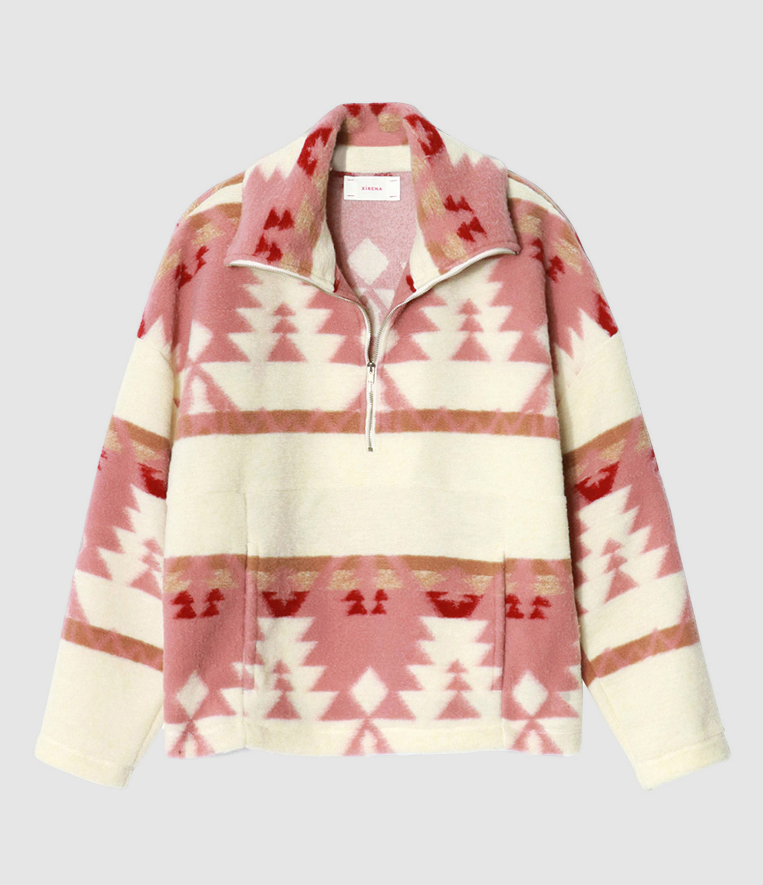 Pull à imprimé écru et rose. Col camionneur zippé. Manches longues. Une poche kangourou à l'avant. Coupe ample. Base droite.