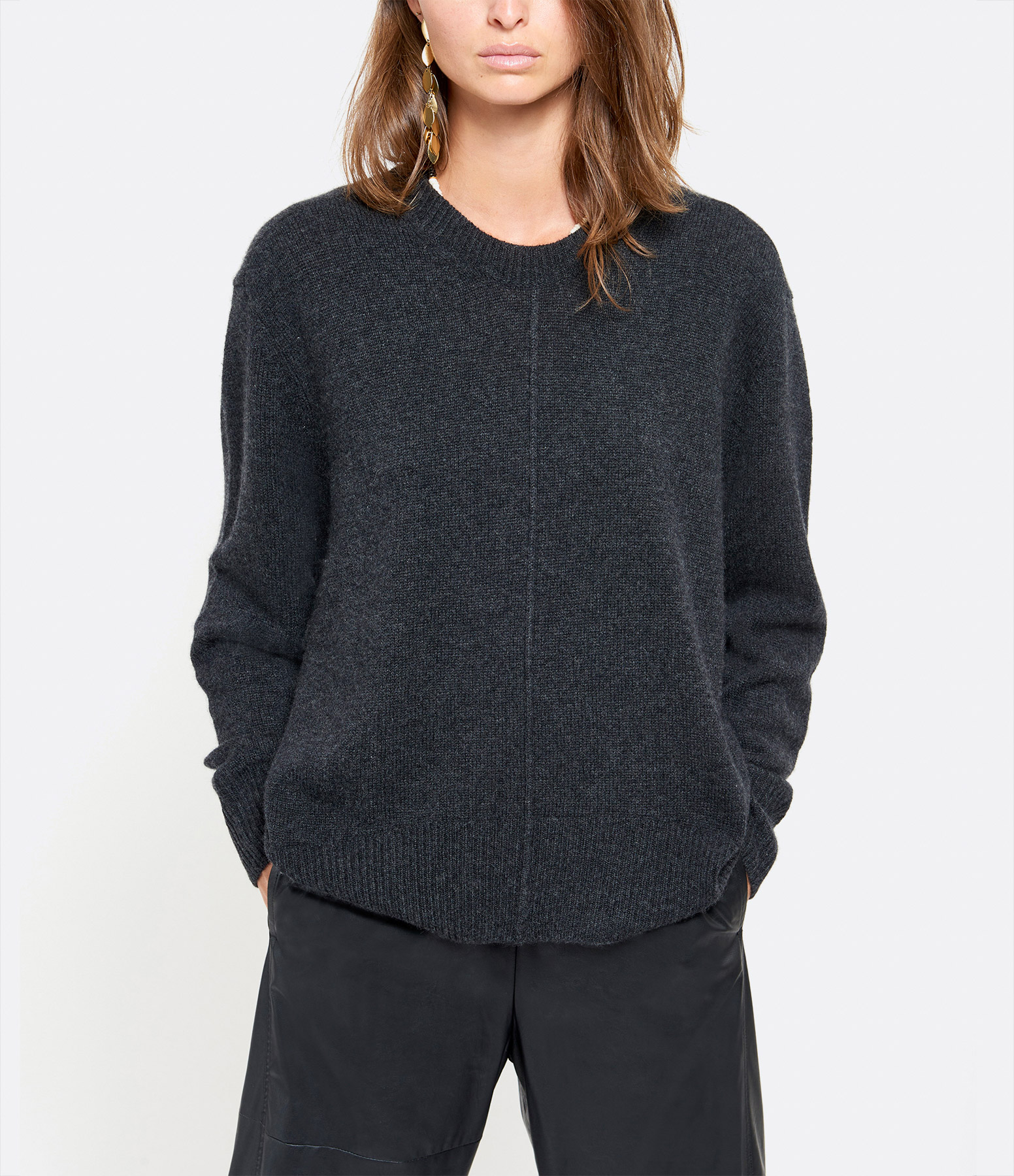 Pull en cachemire noir délavé pour femme. Col rond. Manches longues. Coupe oversize. Légèrement plus long à l'arrière. Resserré sur le bas et les manches par bord côtes.