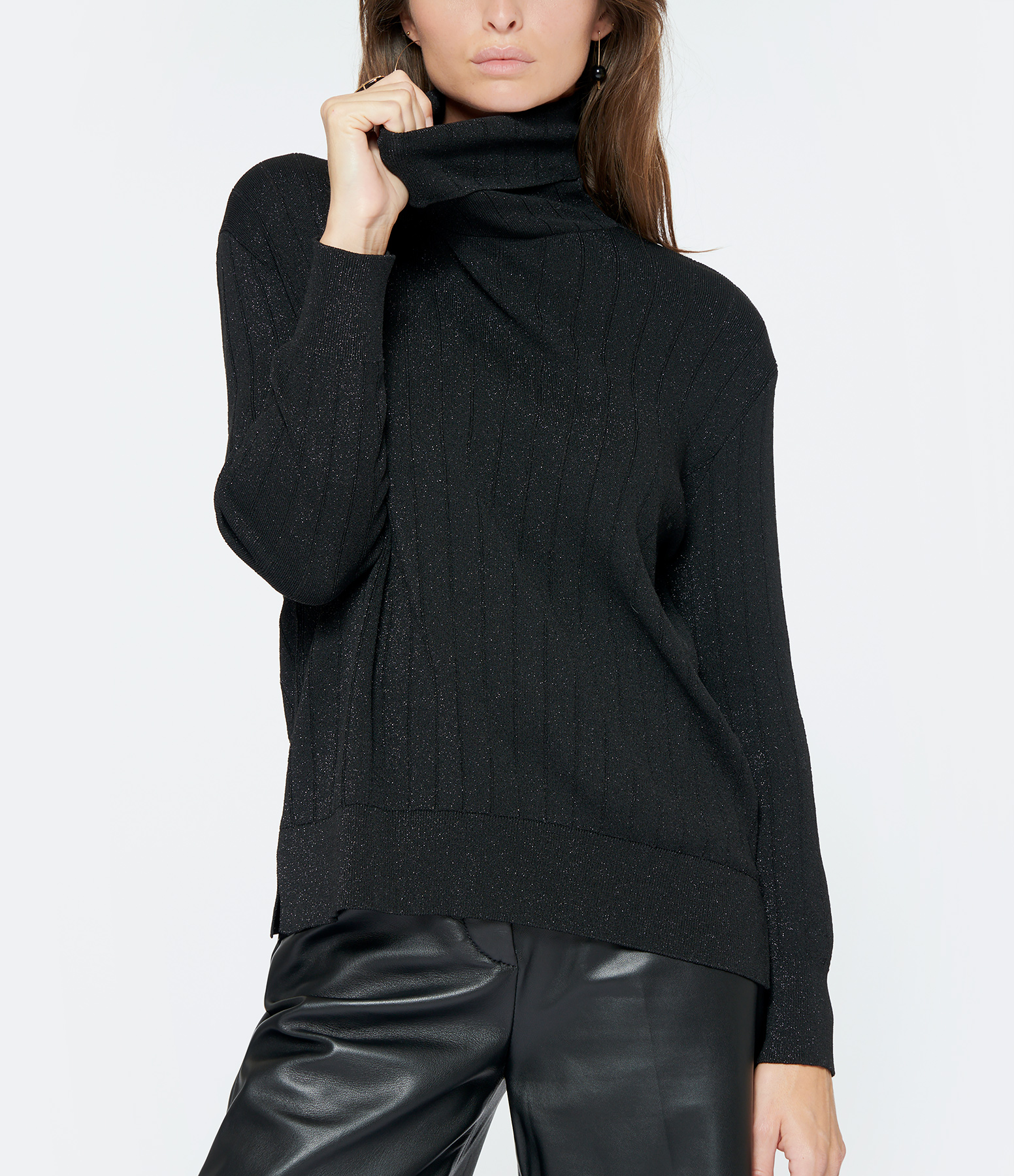 Pull en maille noir réhaussé de fins fils métallisés argentés. Col roulé. Manches longues avec poignets côtelés. Petites fentes latérales. Coupe près du corps. Base droite côtelée.