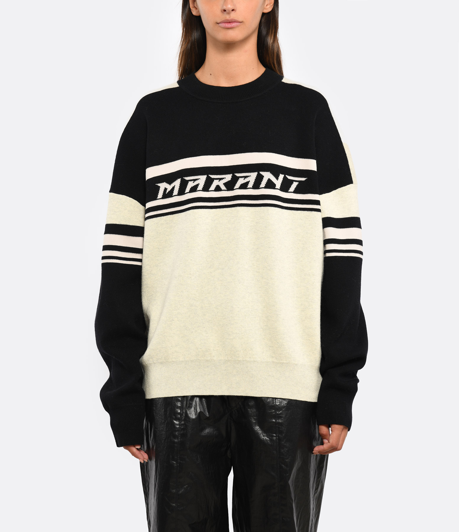 Pull col rond noir et blanc. Imprimé MARANT écru sur la poitrine. Manches longues à épaules tombantes et resserrées aux poignets. Coupe droite large. Base droite.