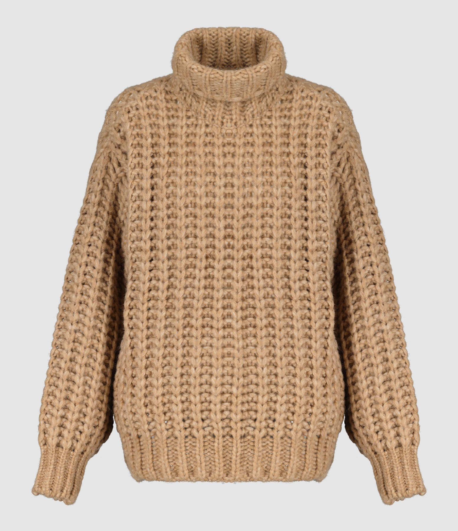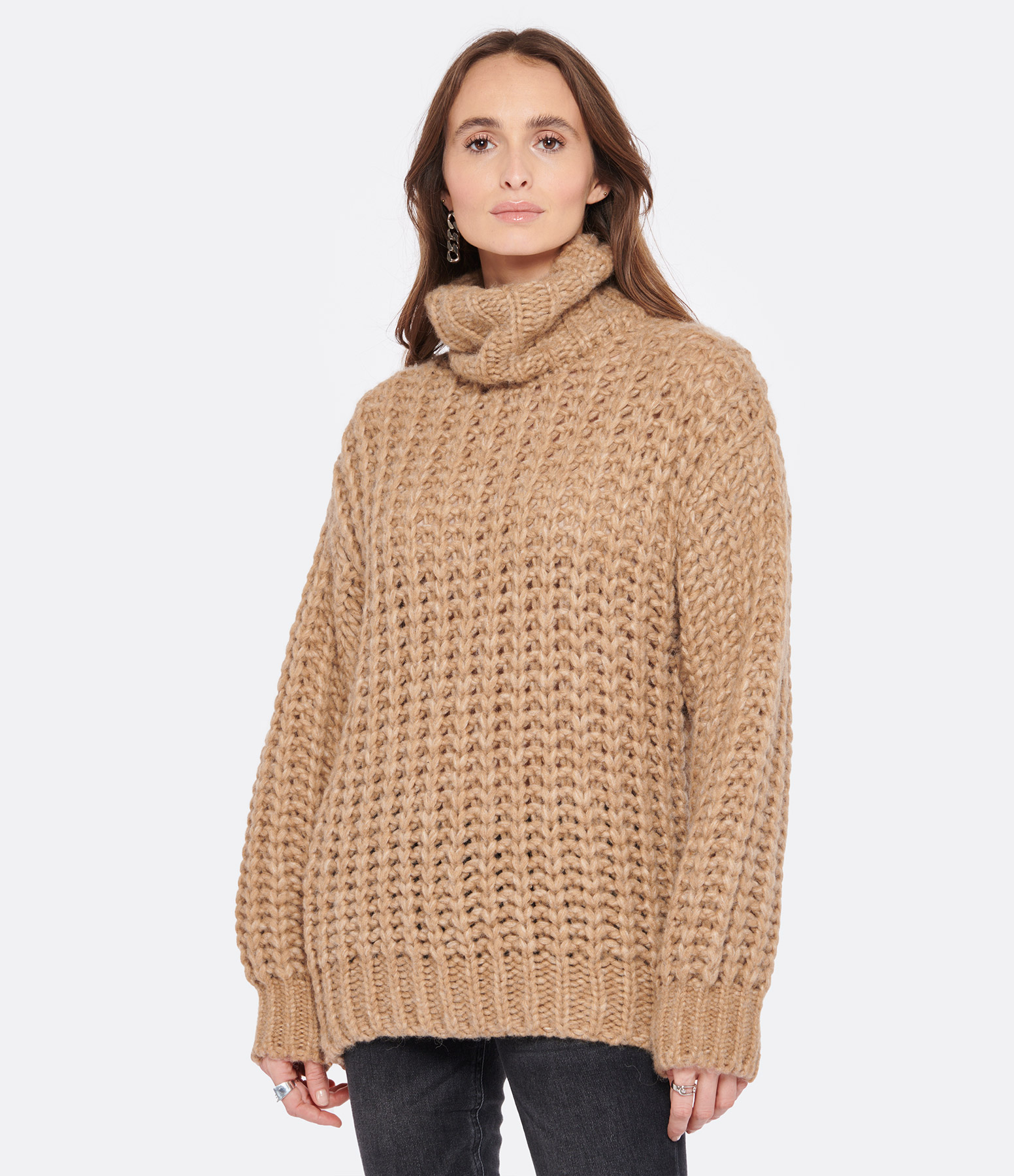 Pull en laine marron chiné. Col roulé. Manches longues. Coupe ample. Base droite.