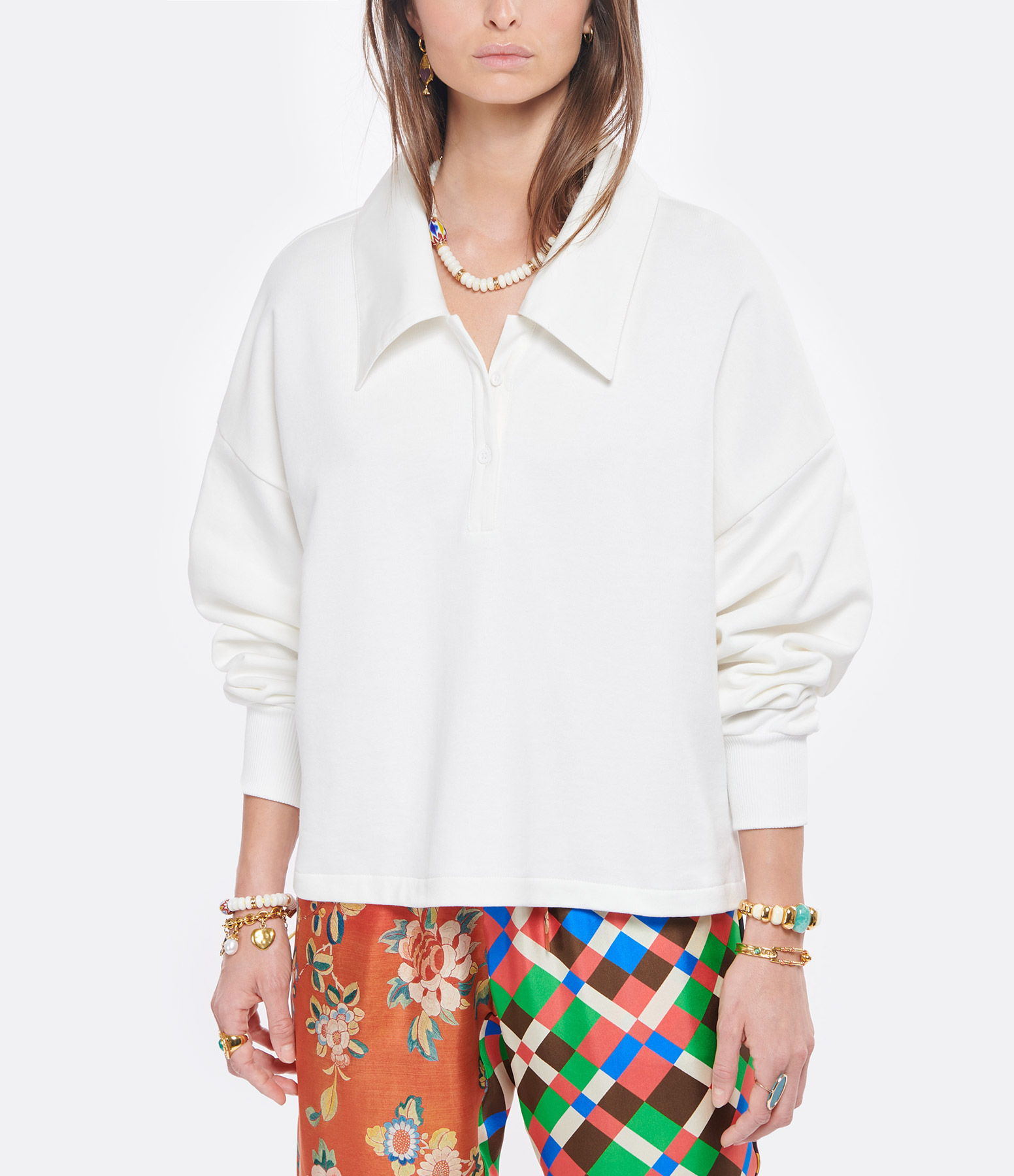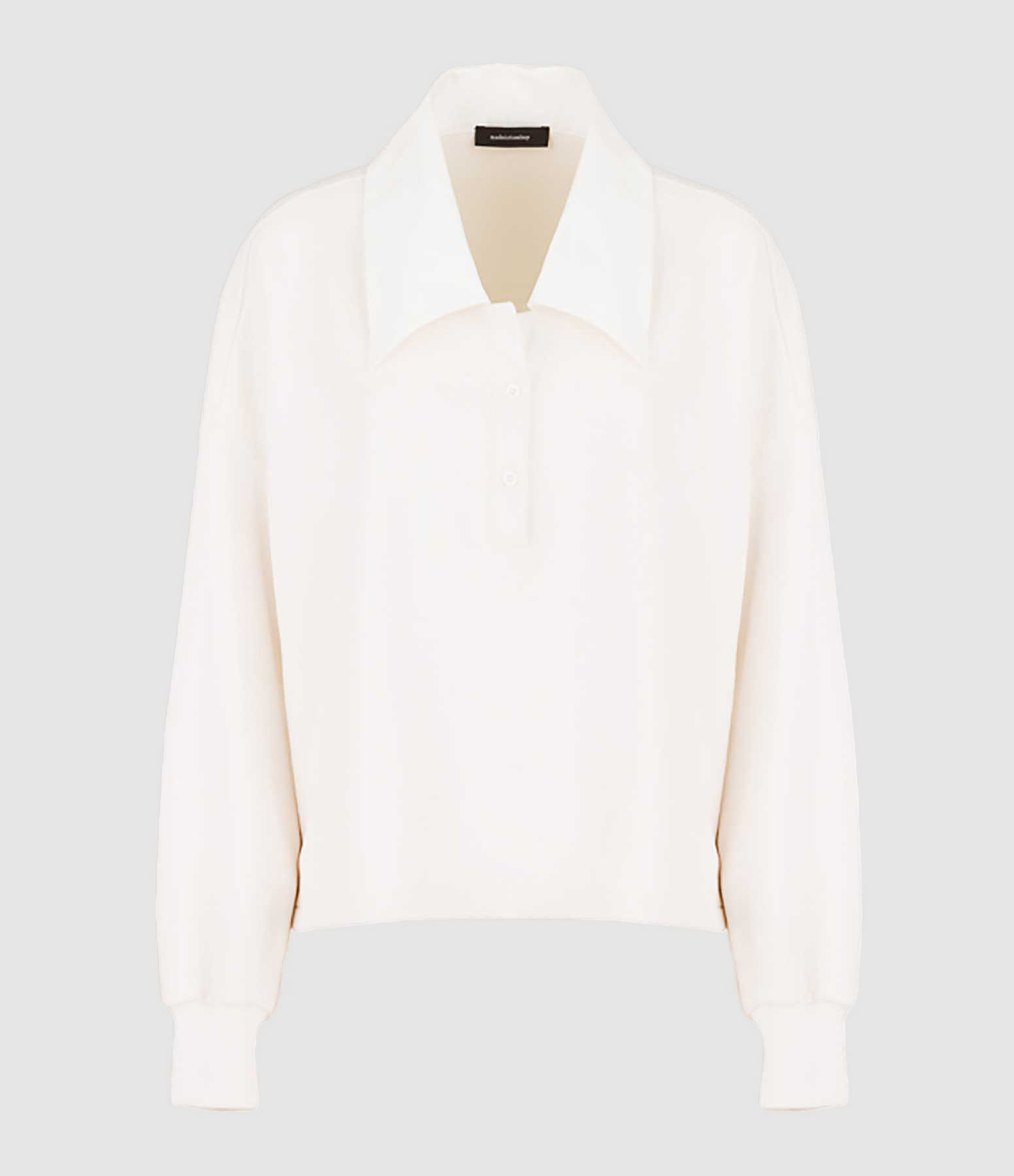 Pull en coton blanc. Col chemise en coton effet bi-matière. Fermeture boutonnée. Manches longues élastiquées. Matière intérieure effet éponge. Coupe ample.