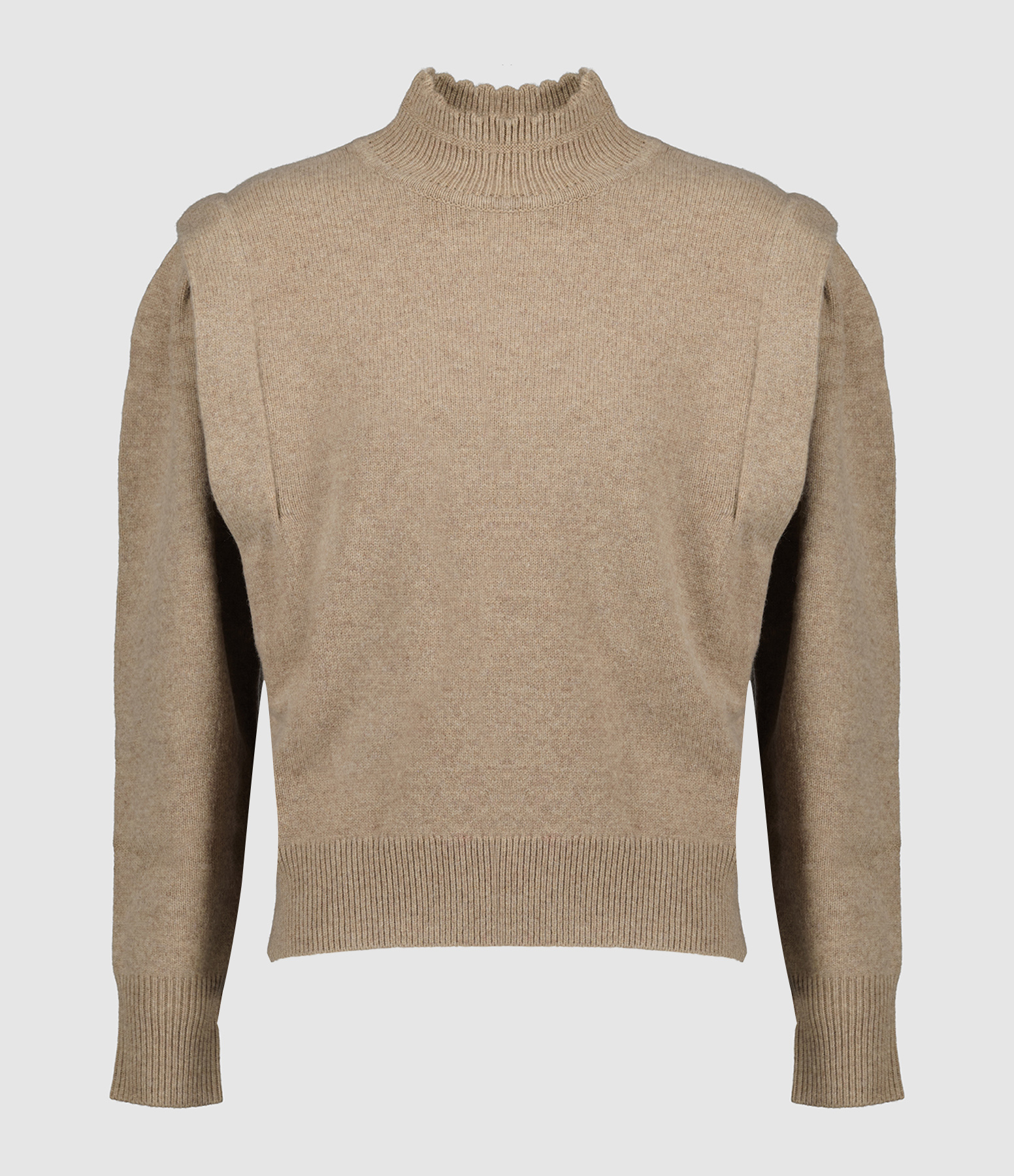 Pull en maille de laine mélangée beige. Col montant côtelé à ourlet festonné. Manches longues gigot avec poignet côtelé. Épaules structurées. Coupe droite. Base droite côtelée.
