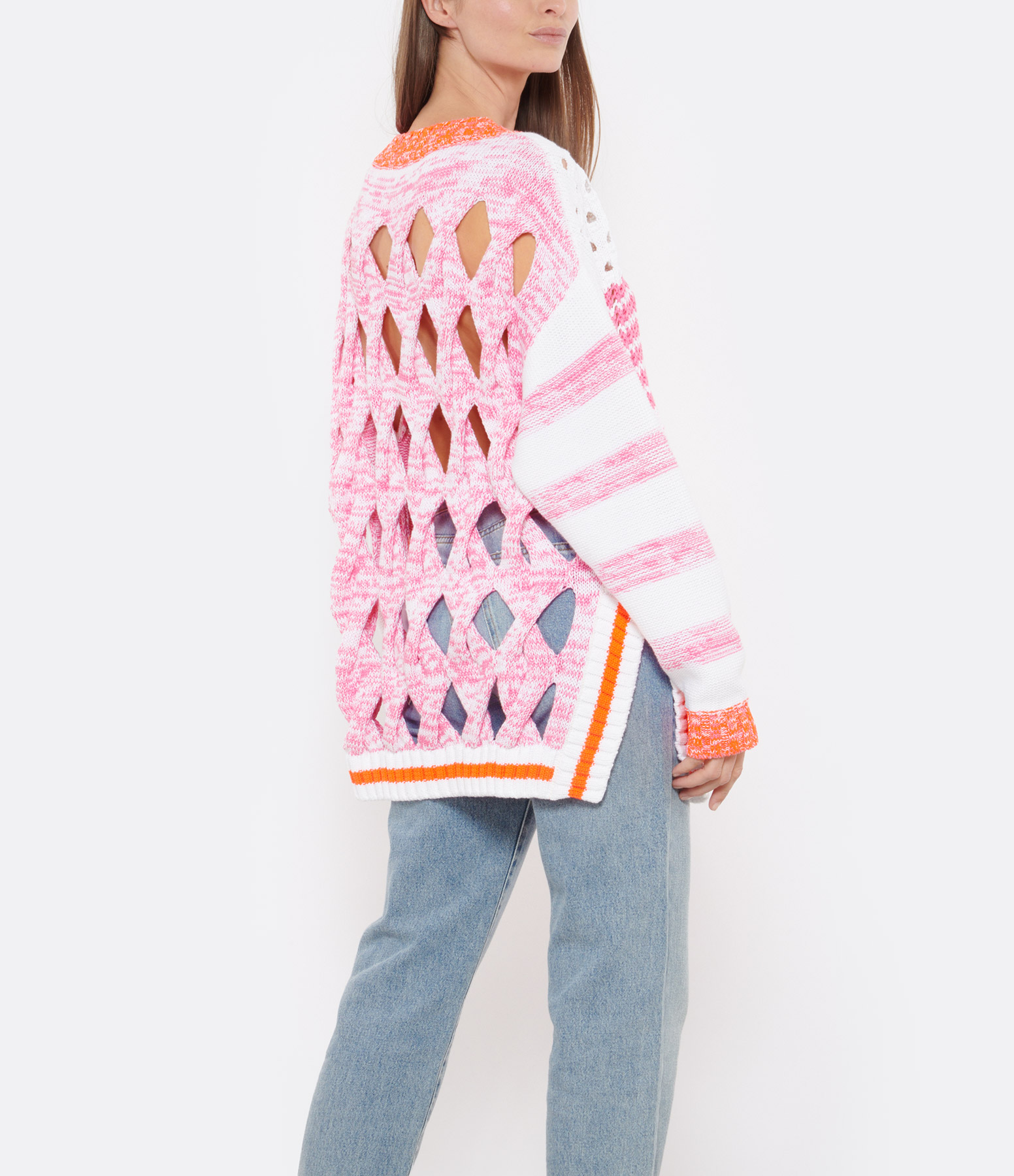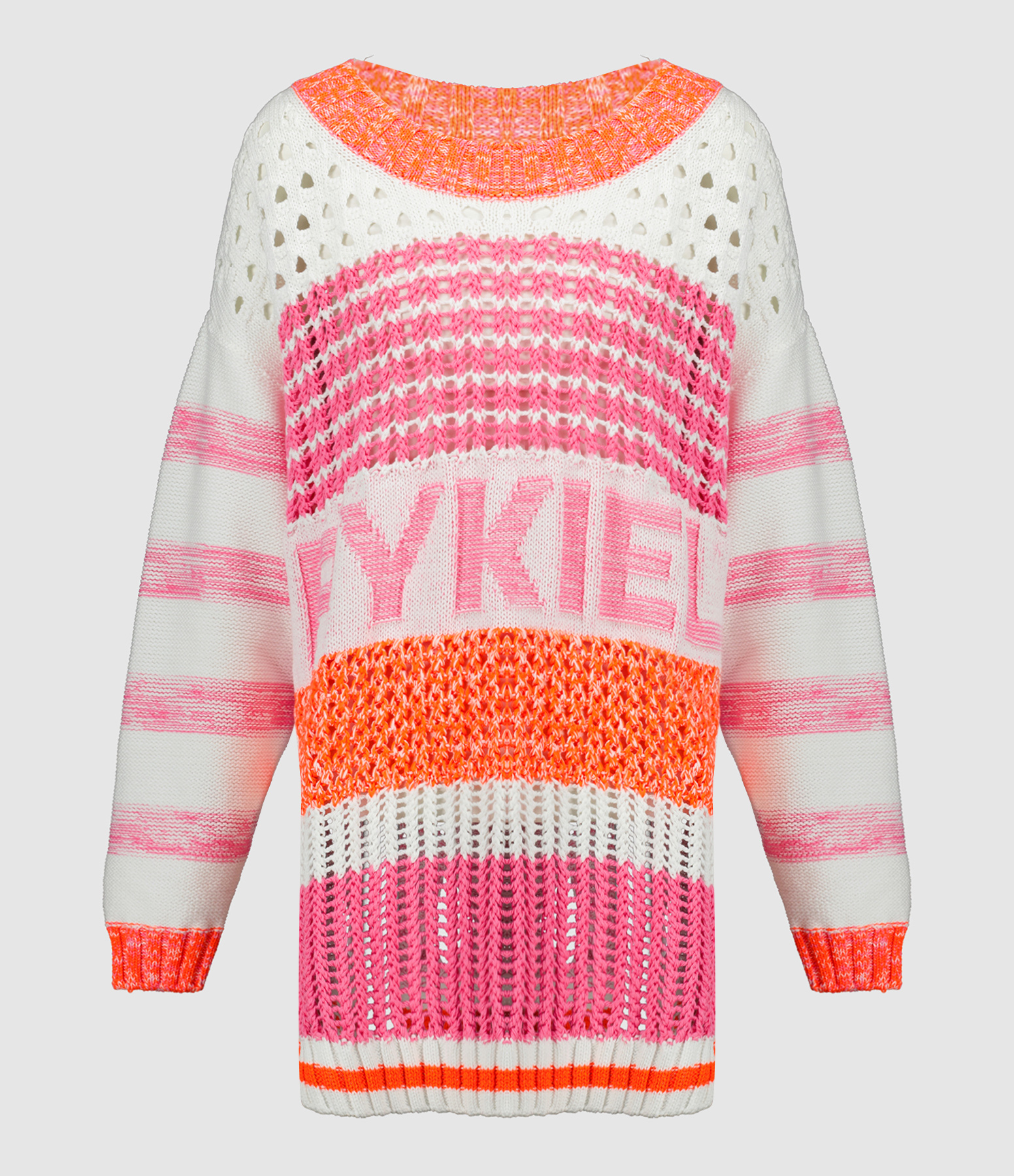 Pull en maille blanc, orange et rose en coton mélangé. Détails de découpes et ajouré sur l'ensemble. Col rond côtelé. Manches longues. Inscription "RYKIEL" brodée à l'avant. Une fente latérale. Coupe ample, droite. Base droite côtelée.