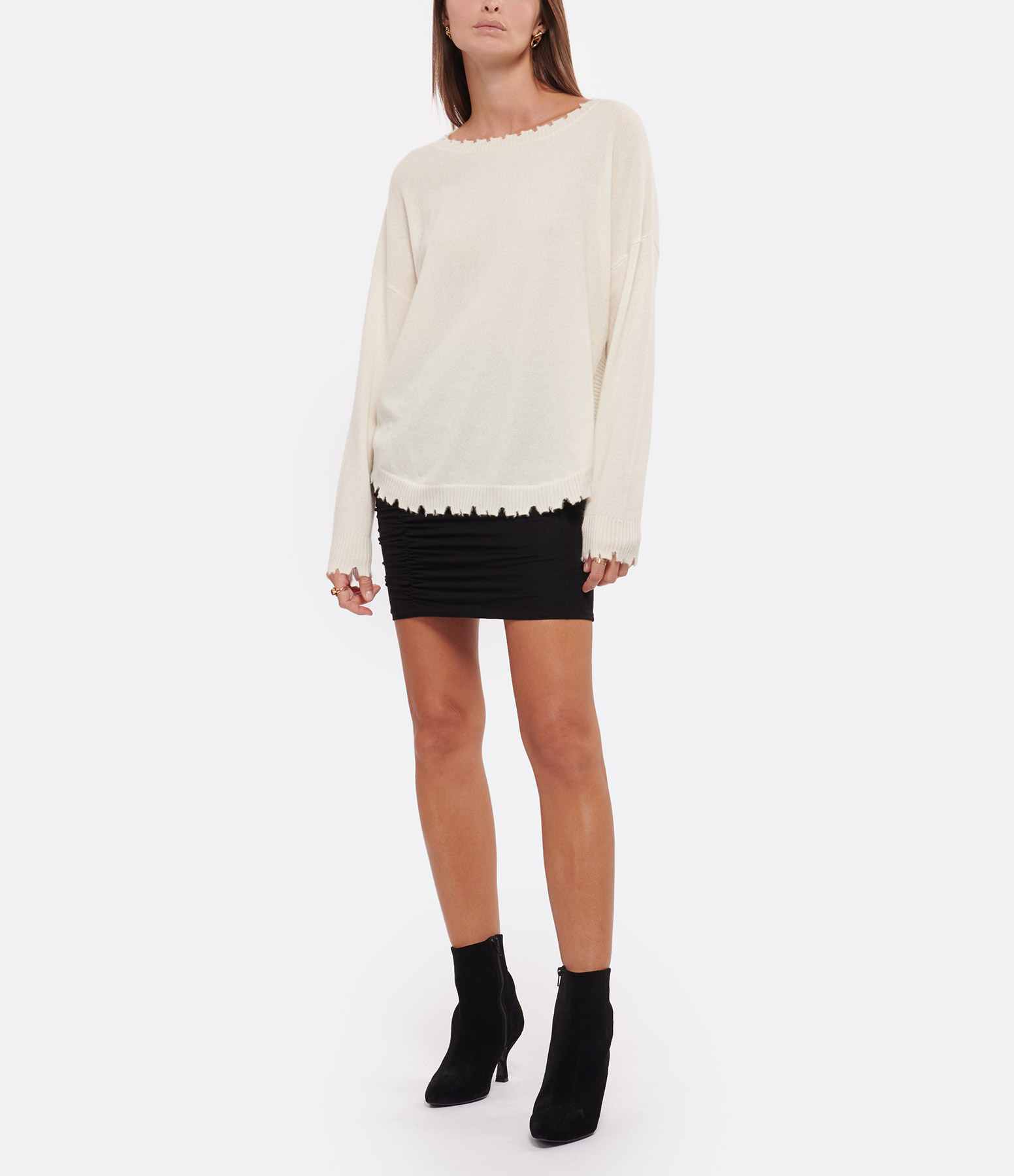 Pull en cachemire blanc. Col rond. Manches longues. Bords découpés effet déchirés. Coupe oversize. Base arrondie.