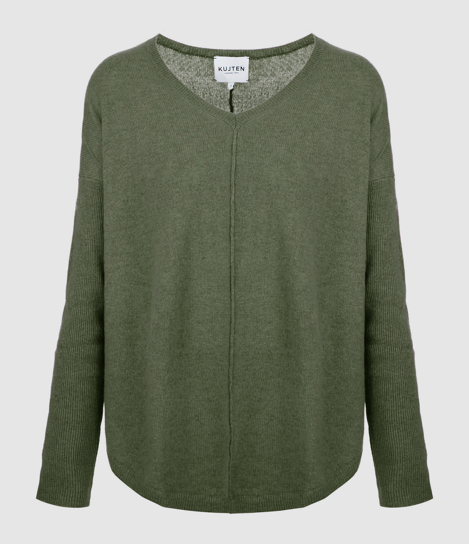 Pull en cachemire kaki. Col V. Manches longues. Coupe large. Base arrondie.