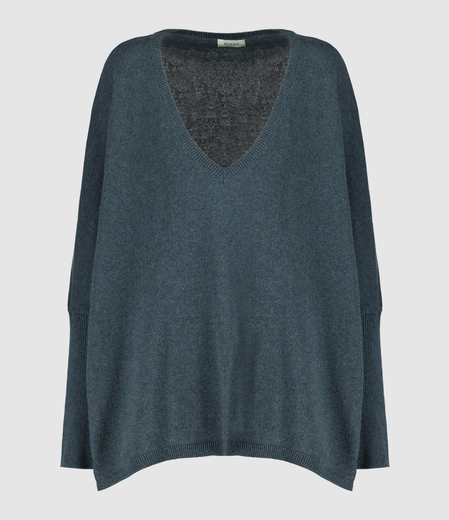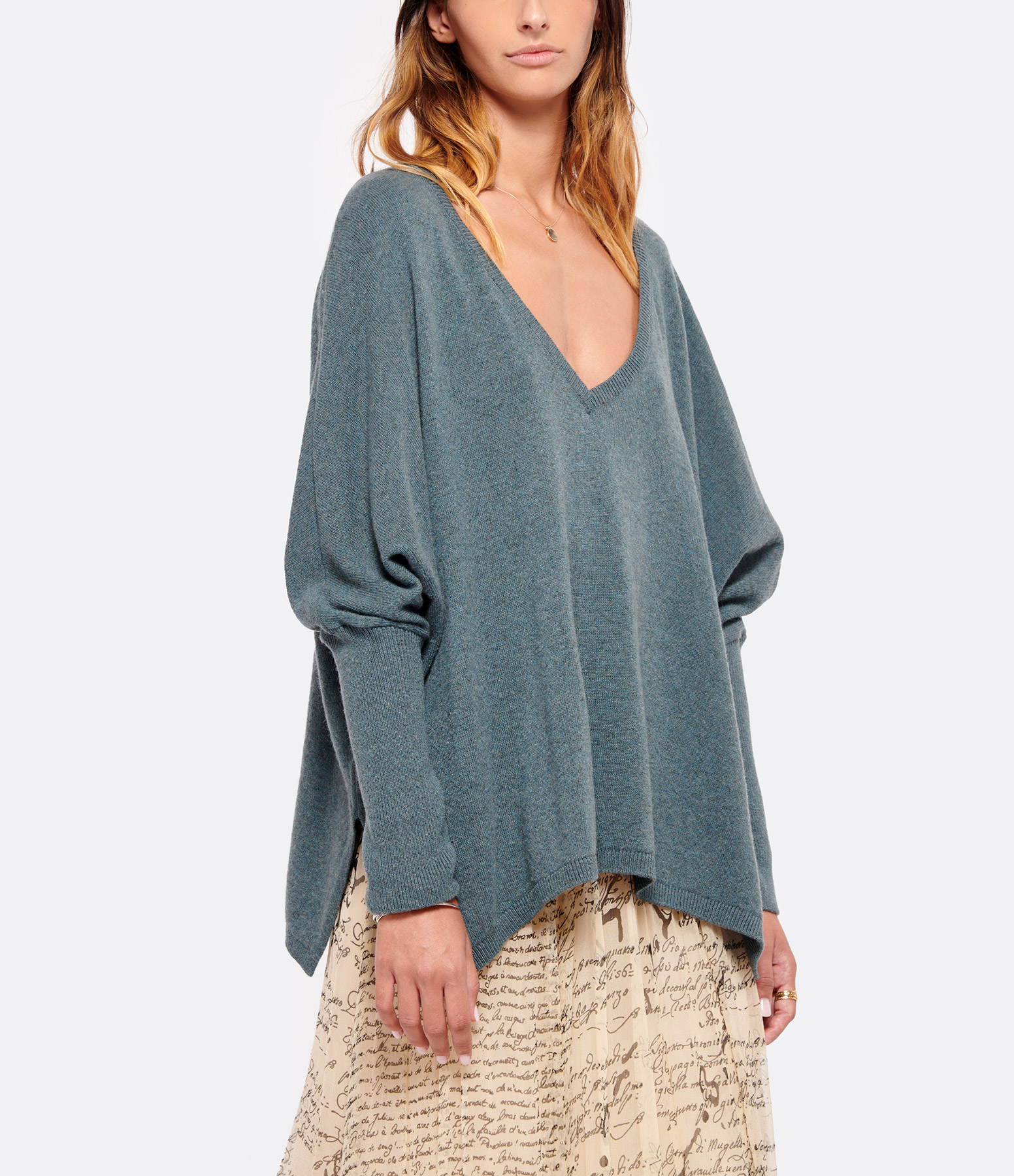 Pull en laine bleu. Col en V. Manches longues chauve-souris, resserrées au niveau des avant-bras. Coupe oversize. Base droite fendue sur les côtés.