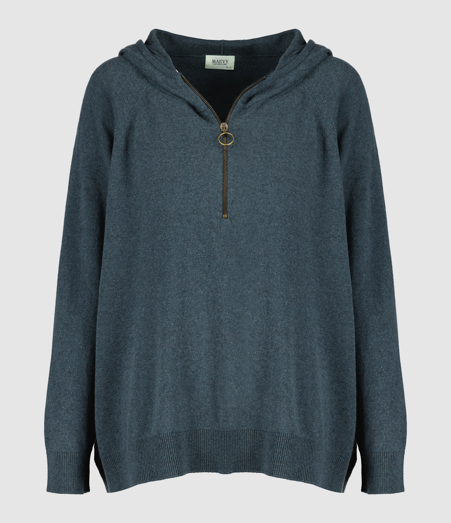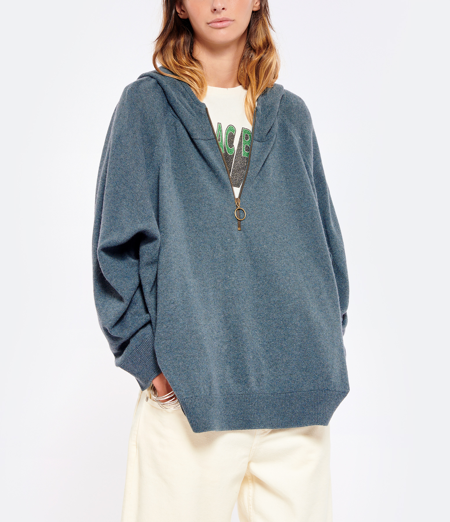 Pull en maille de laine et cachemire mélangées bleu encre. Col en V zippé à capuche. Manches longues raglans avec poignets côtelés. Coupe droite large. Base droite côtelée.