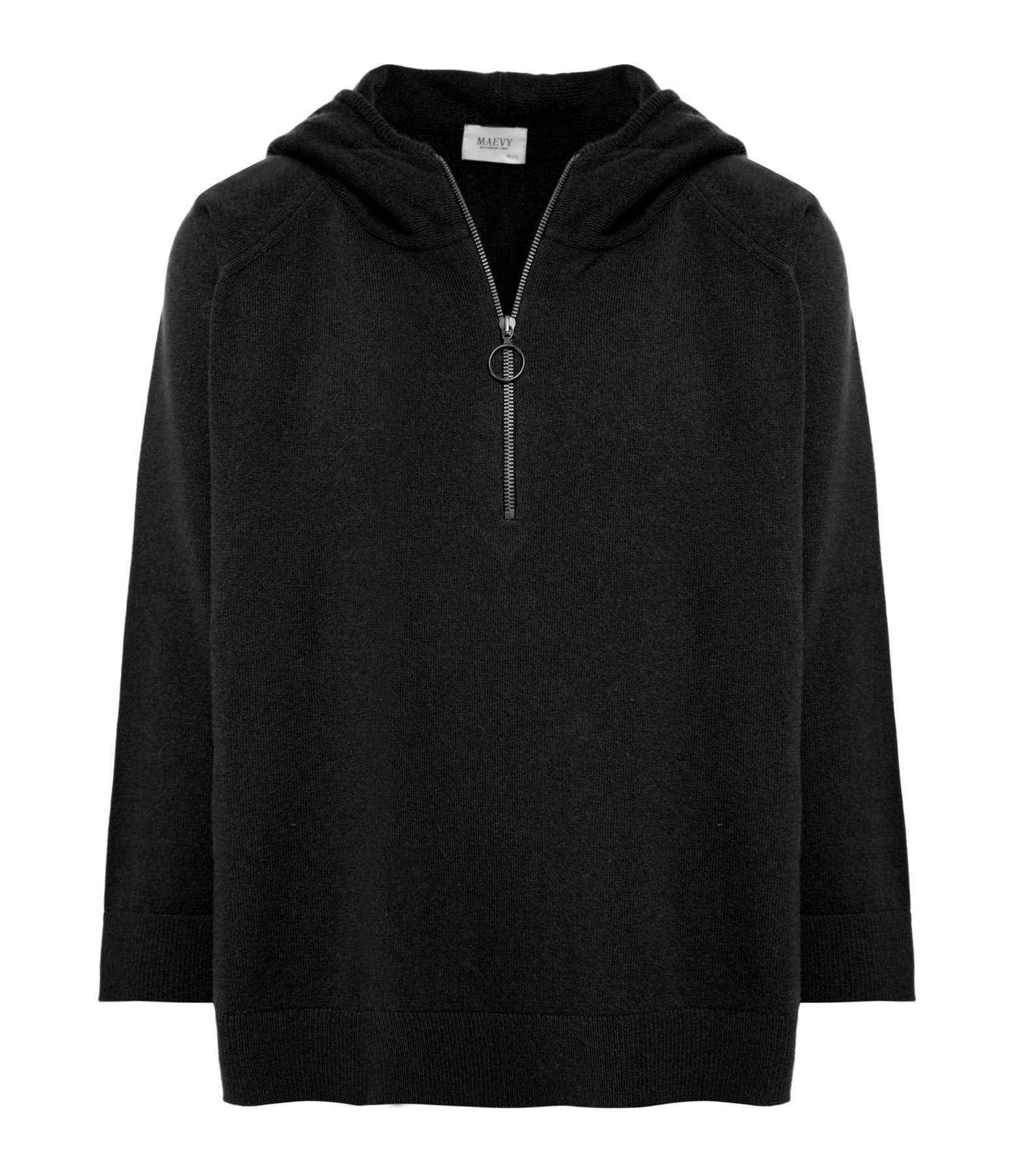 Pull à capuche noir, en laine. Col fermé par un zip. Manches longues. Coupe oversize. Base droite.