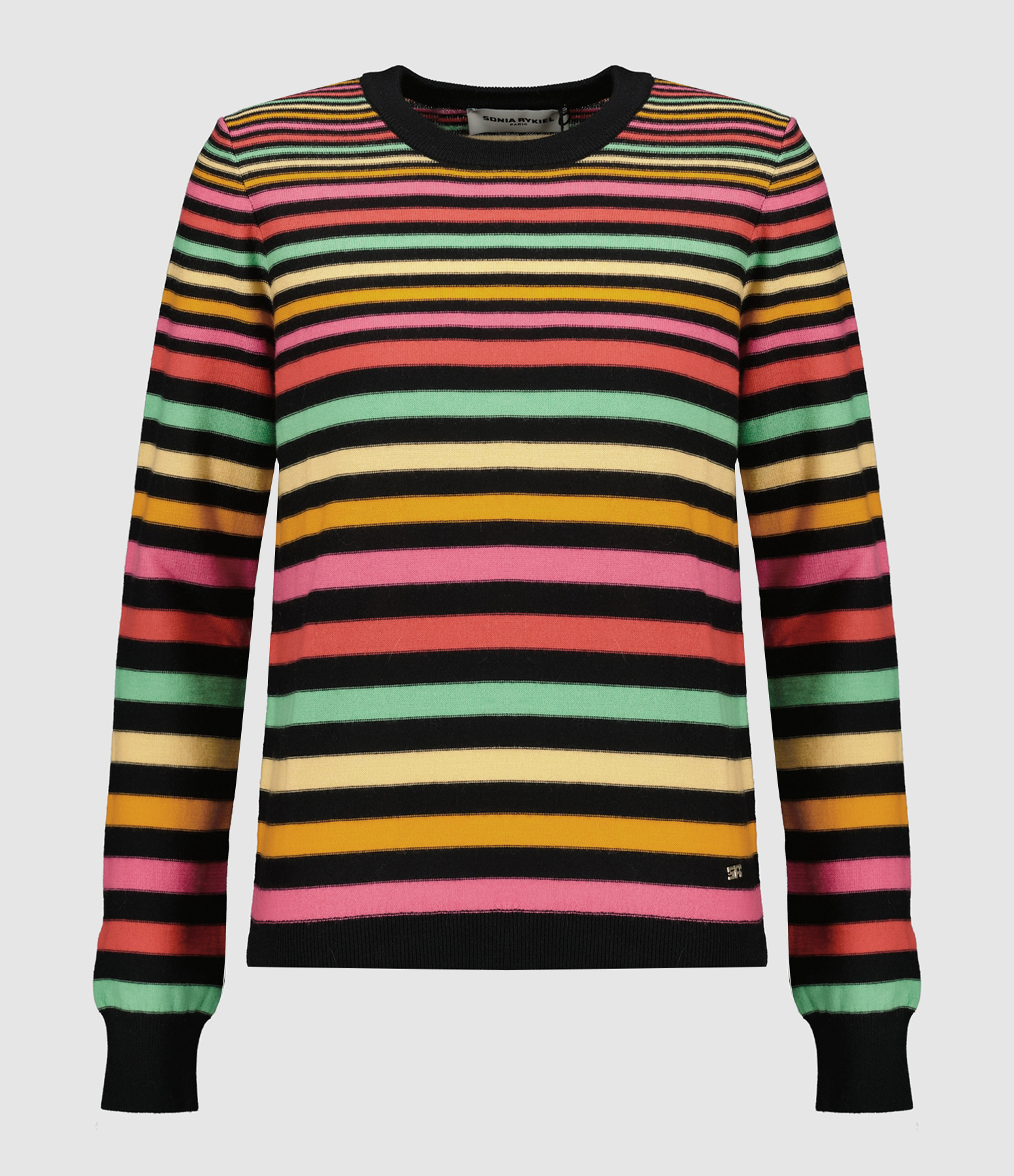 Pull en laine à rayures multicolores icônes Sonia Rykiel. Col rond côtelé. Manches longues. Coupe droite. Base droite.