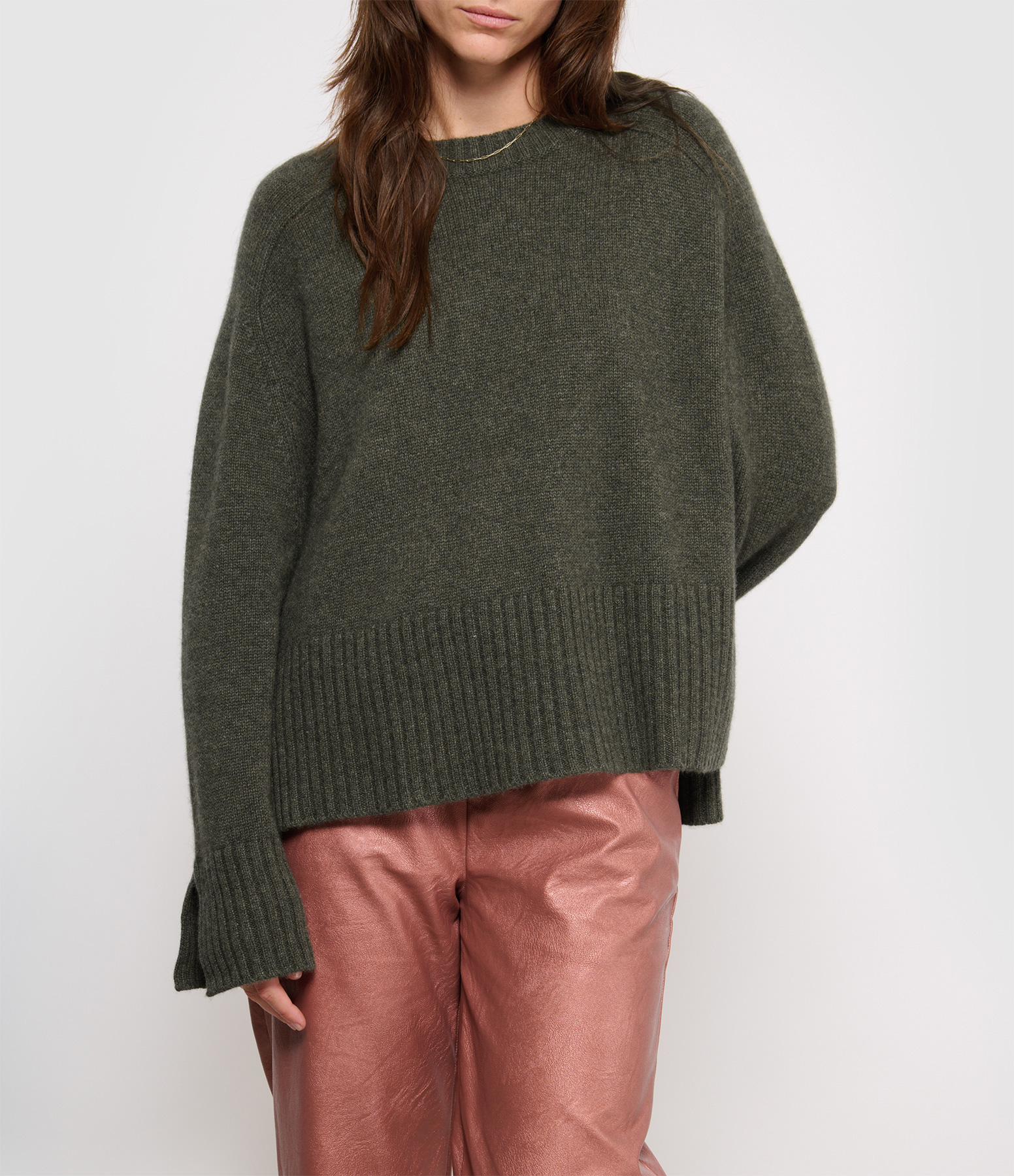 Pull en cachemire 4 fils. Manches longues à épaules tombantes. Détails ajourés dans le dos. Coupe large. Bords larges côtelés.
