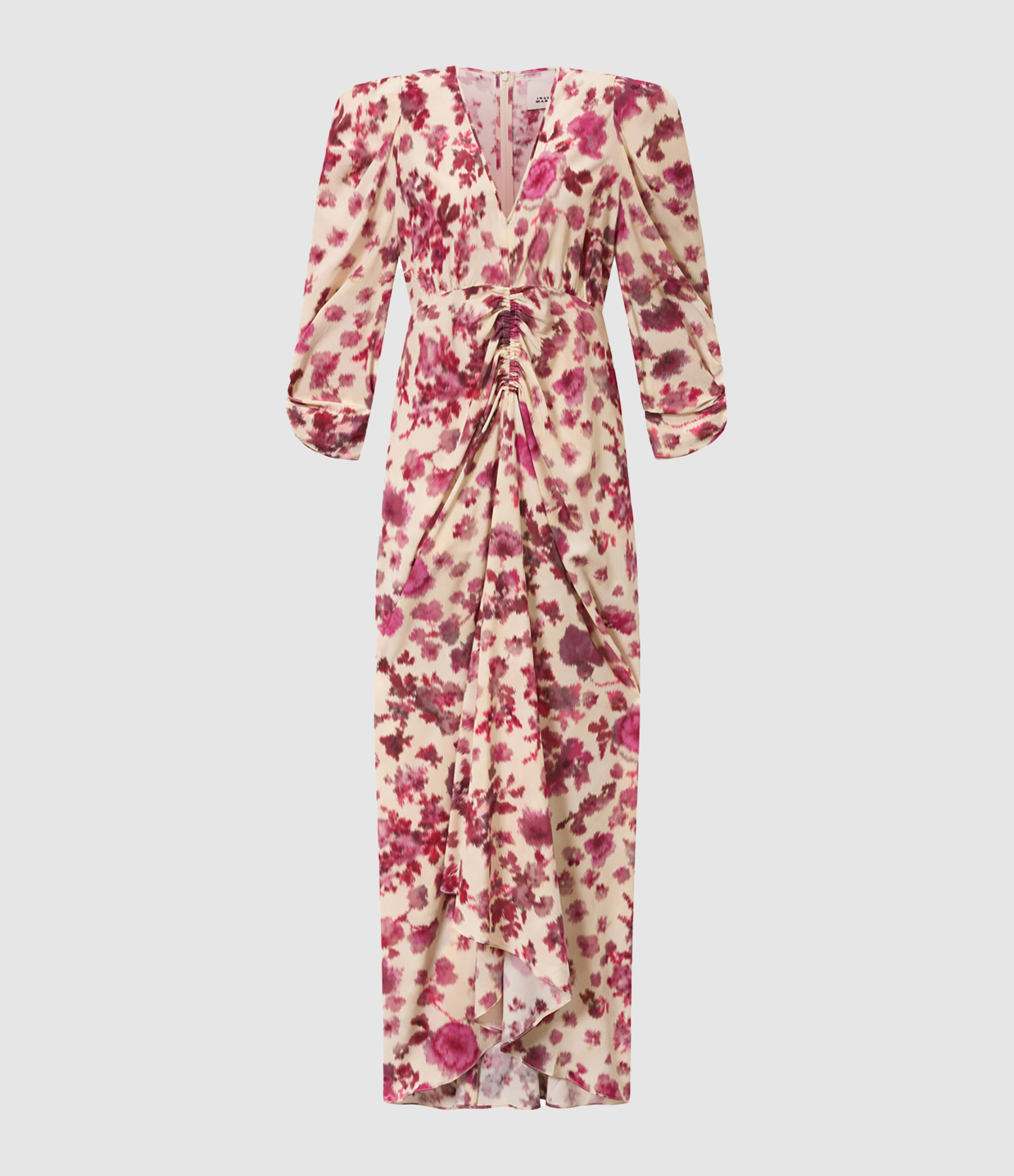 Robe longue en soie stretch à imprimé écru. Col en V. Manches 7/8 plissées avec épaulettes. Fermeture zippée invisible et à crochet dans le dos. Plissée à l'avant et au dos. Coupe buste cintrée. Coupe jupe évasée. Base arrondie plus longue à l'arrière. Non doublée.