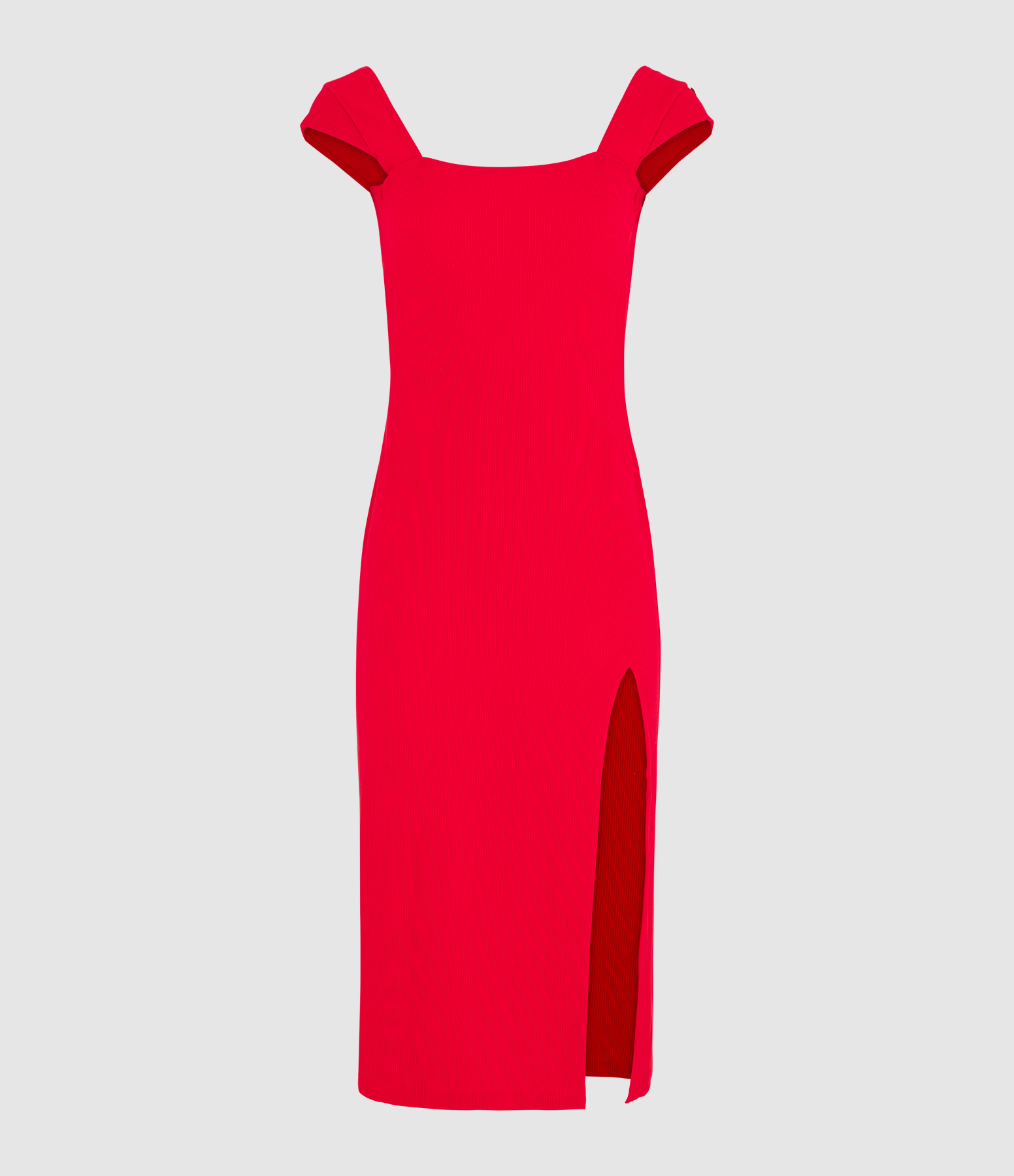 Robe rouge longue côtelé fendue avec dos nu plongeant. Col carré et manchons.