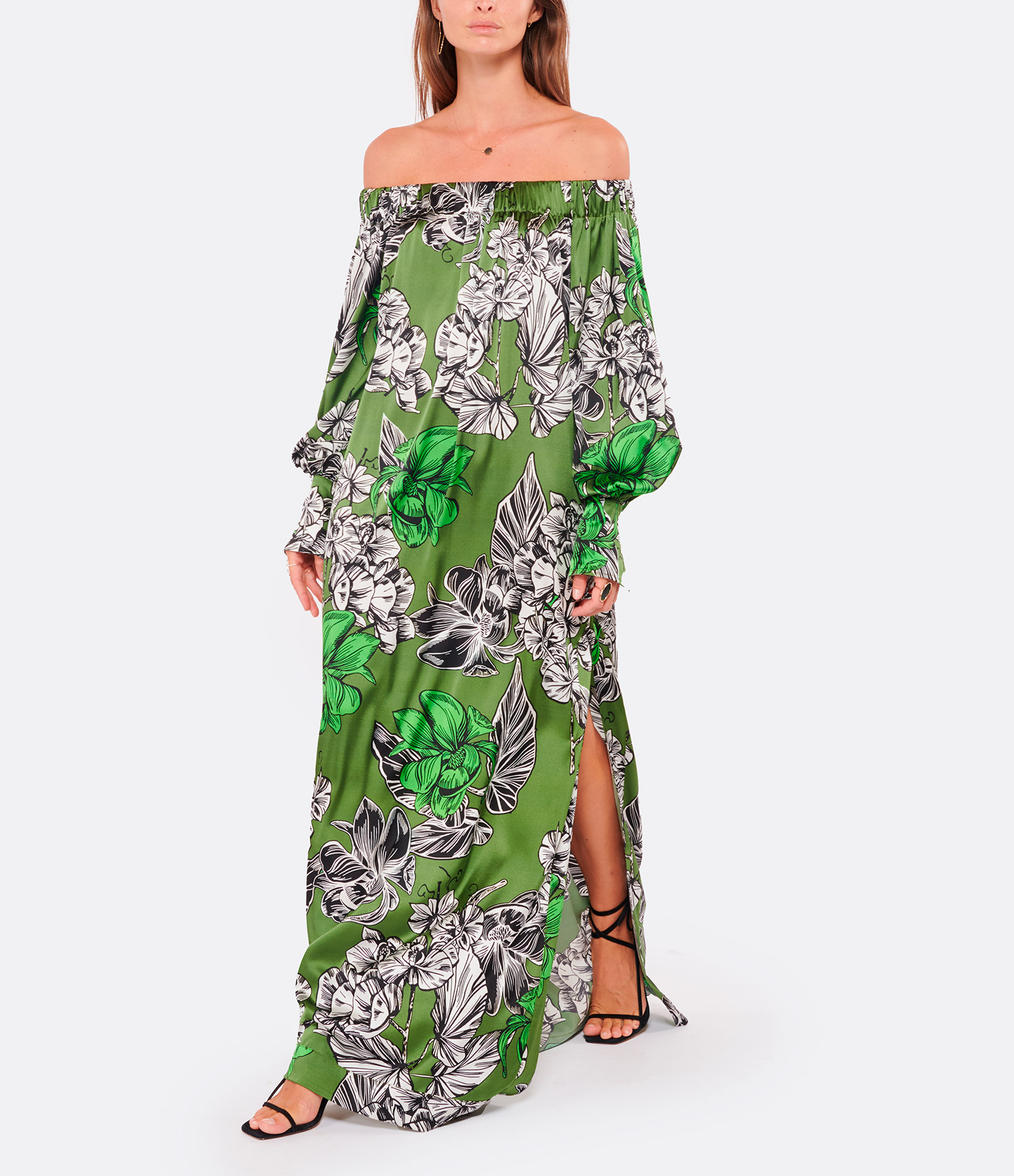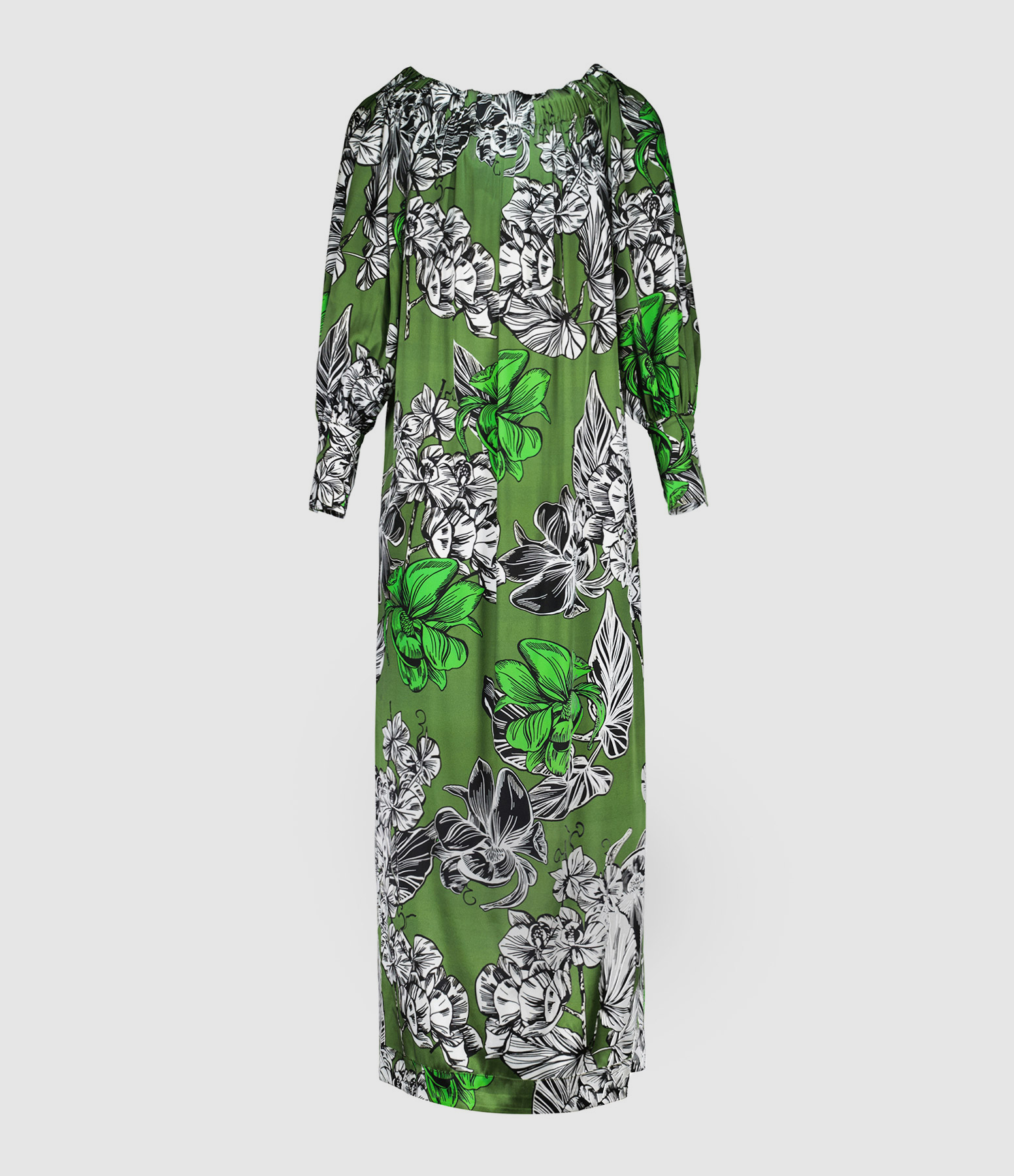 Robe longue en satin de soie à imprimé fleuri vert. Col Bardot froncé. Manches longues bishop avec fentes et poignets boutonnés. Deux poches prises dans la couture sur le devant. Une fente latérale. Coupe droite ample. Base droite.