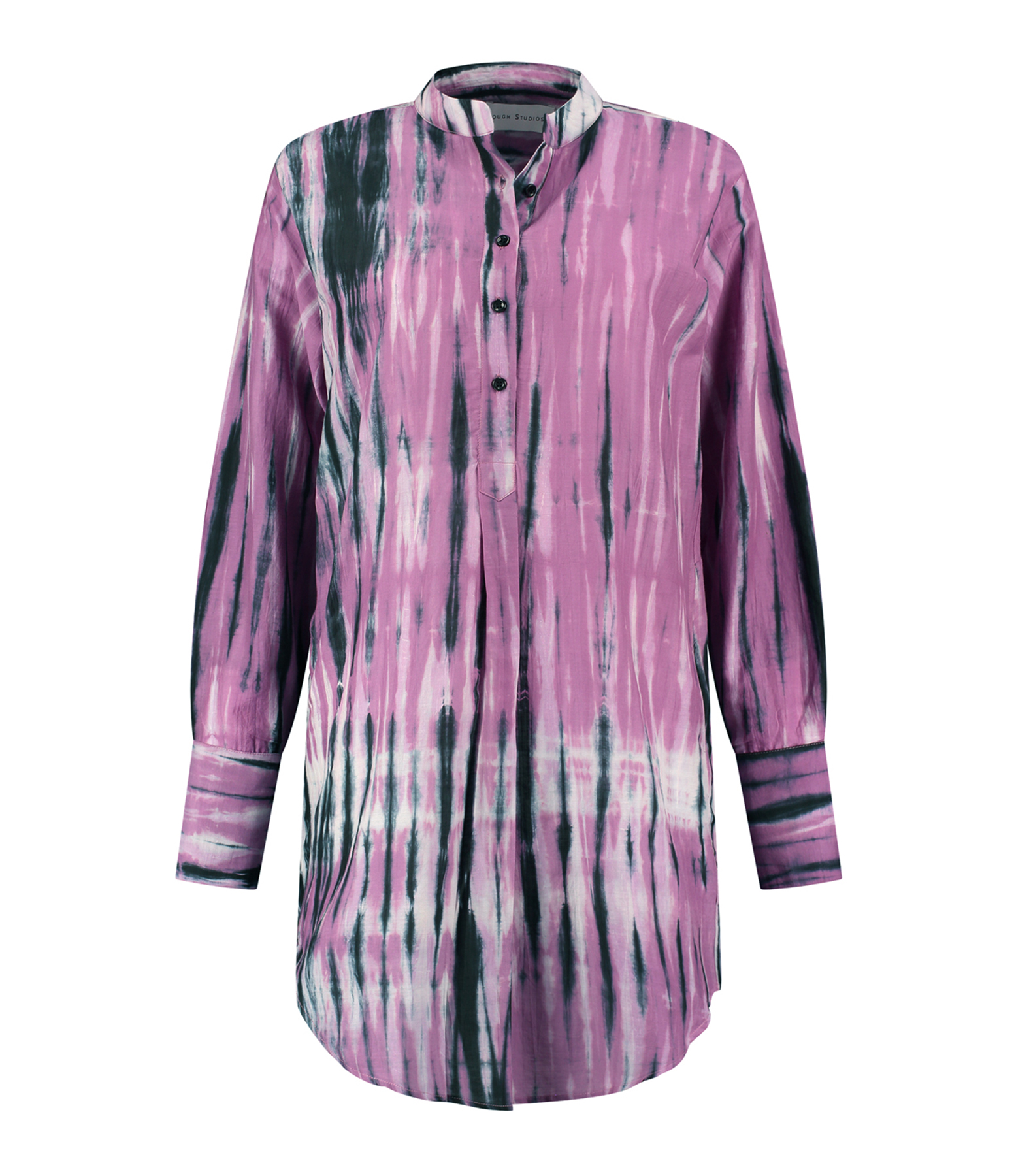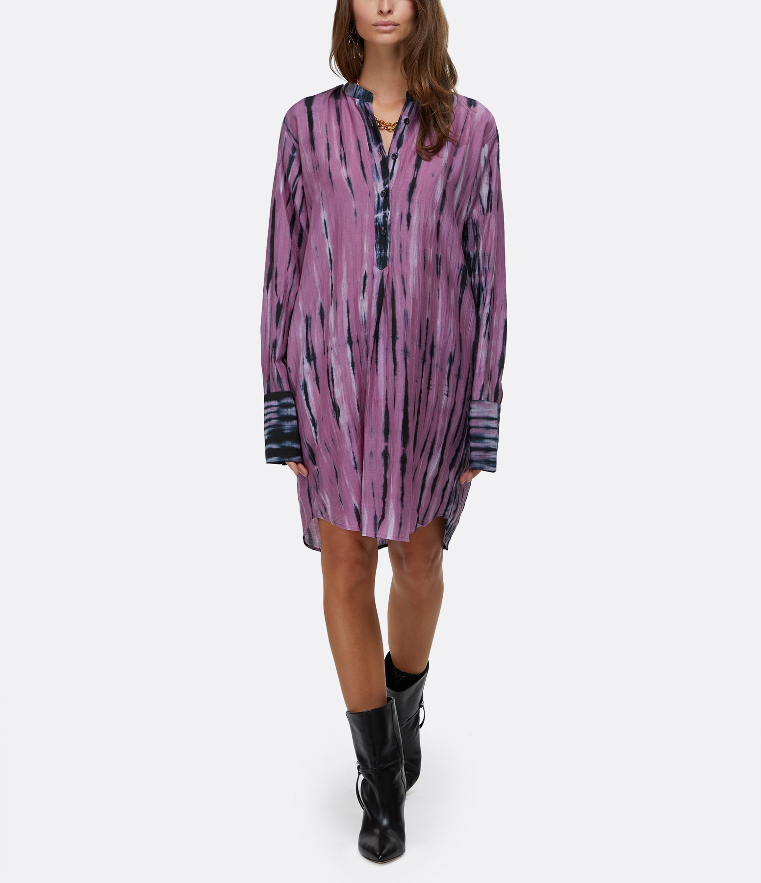 Robe courte à imprimé multicolore. Col rond. Manches longues. Deux poches fendues sur les côtés. Fermeture par boutons. Coupe droite. Base arrondie. Non doublée.