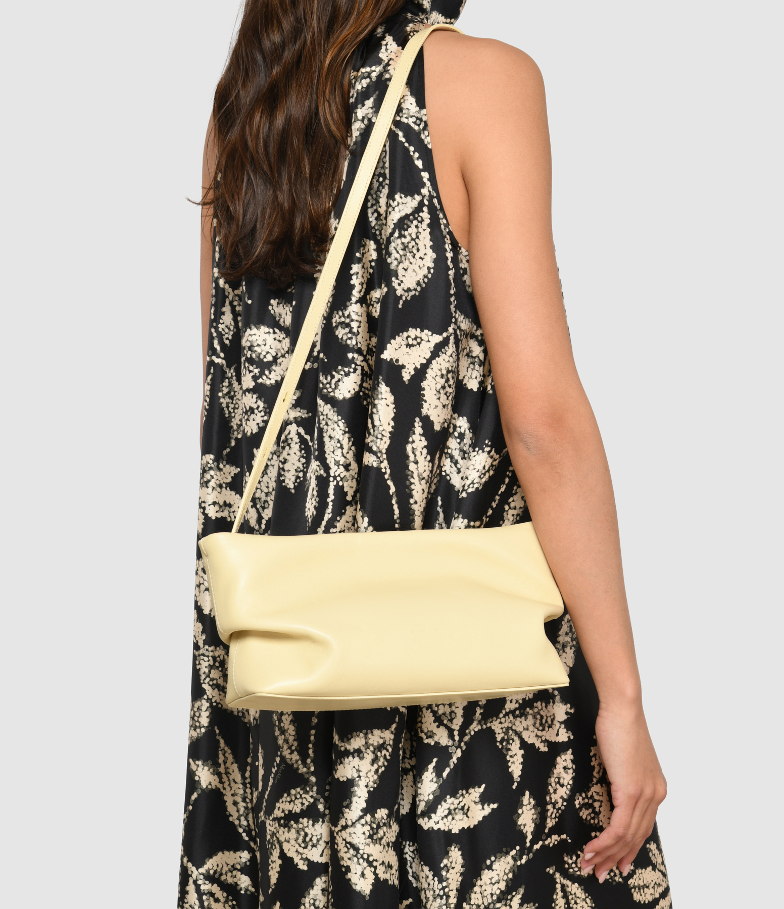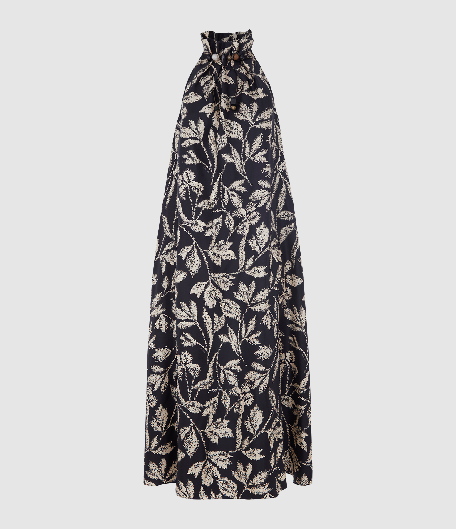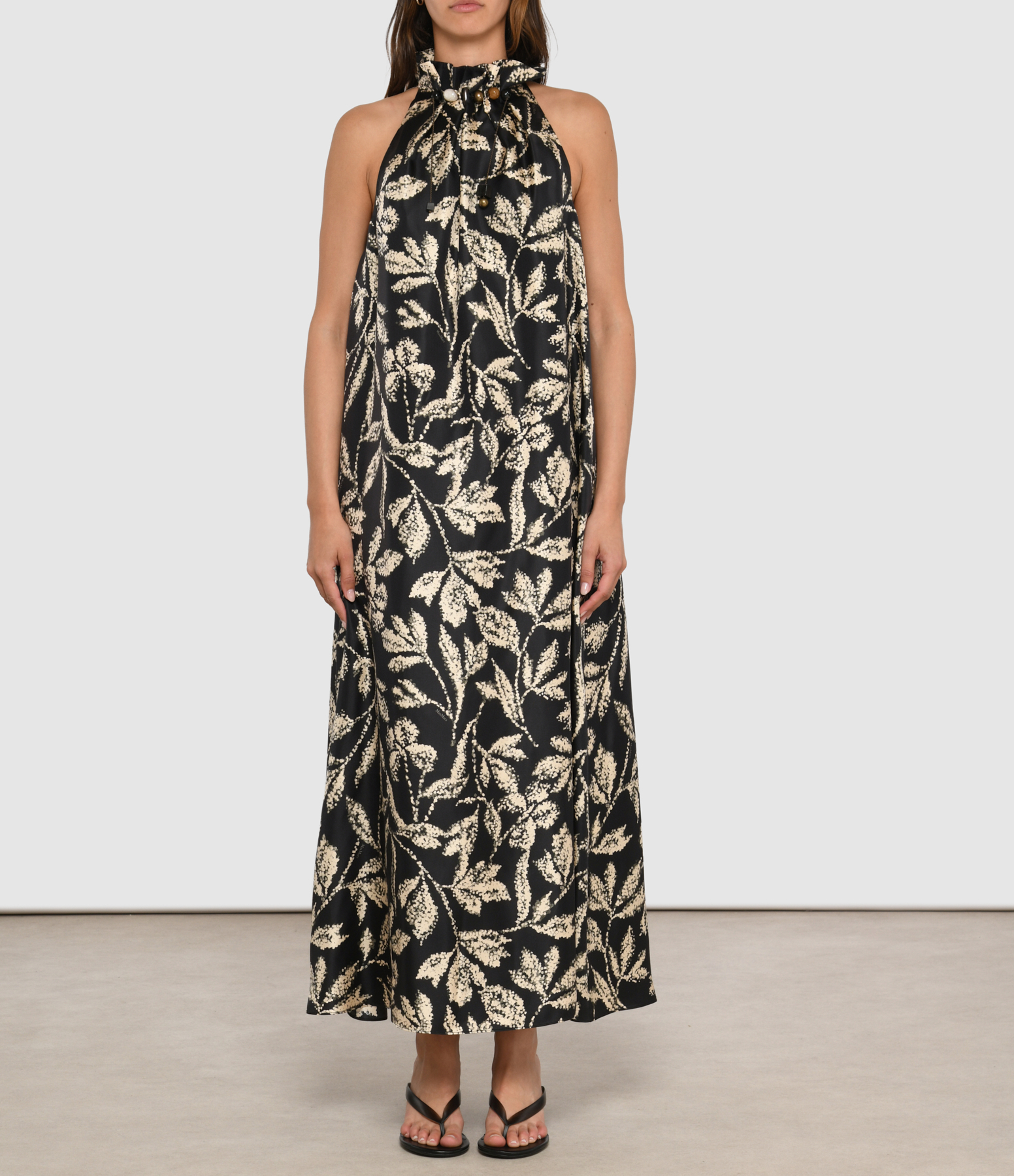 Robe fluide élégante, dotée de perles intégrées autour de l’encolure créant un effet collier.