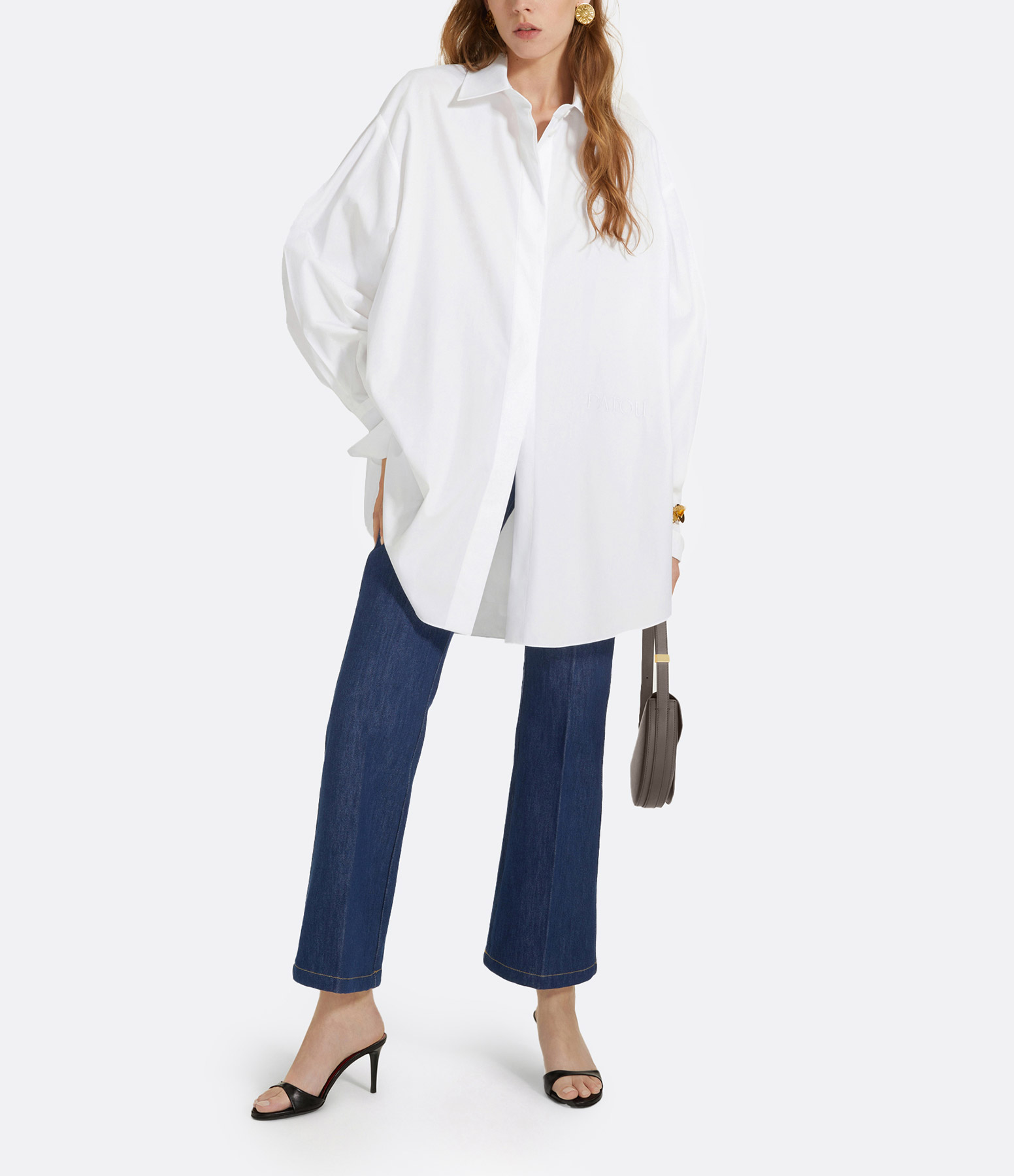 Robe chemise courte en coton blanc. Inscriptions PATOU en gris dans le dos et broderie PATOU ton sur ton à l'avant. Col chemise. Manches longues. Fermeture boutonnée. Coupe ample. Base arrondie. Non doublée.