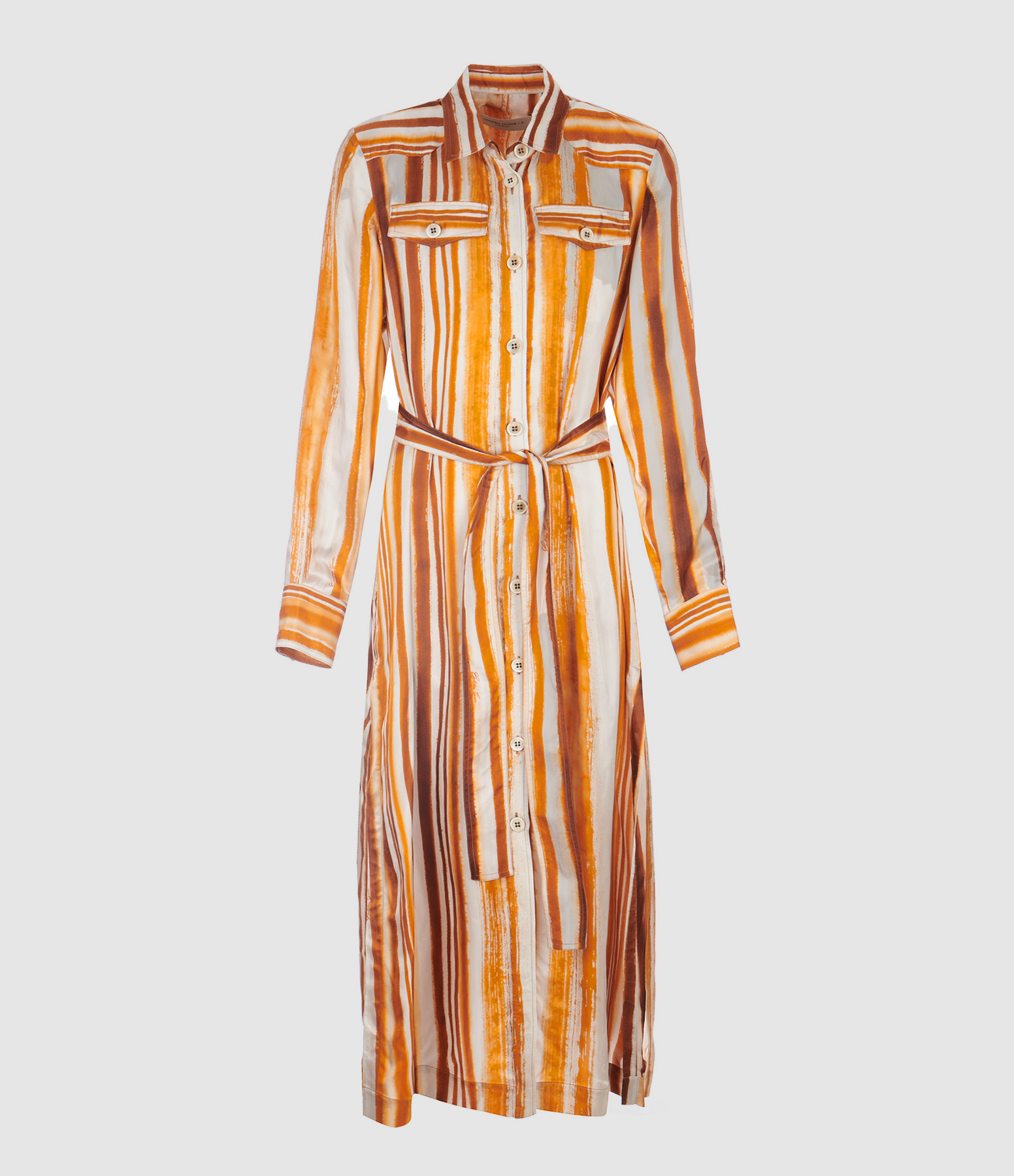 Robe chemise longue rayée orange et écru. Col chemisier. Deux poches plaquées et deux poches fendues à l'avant. Ceinture amovible. Manches longues. Fentes de 57 cm sur les cotés. Fermeture par boutons. Coupe droite. Base droite. Non doublée.