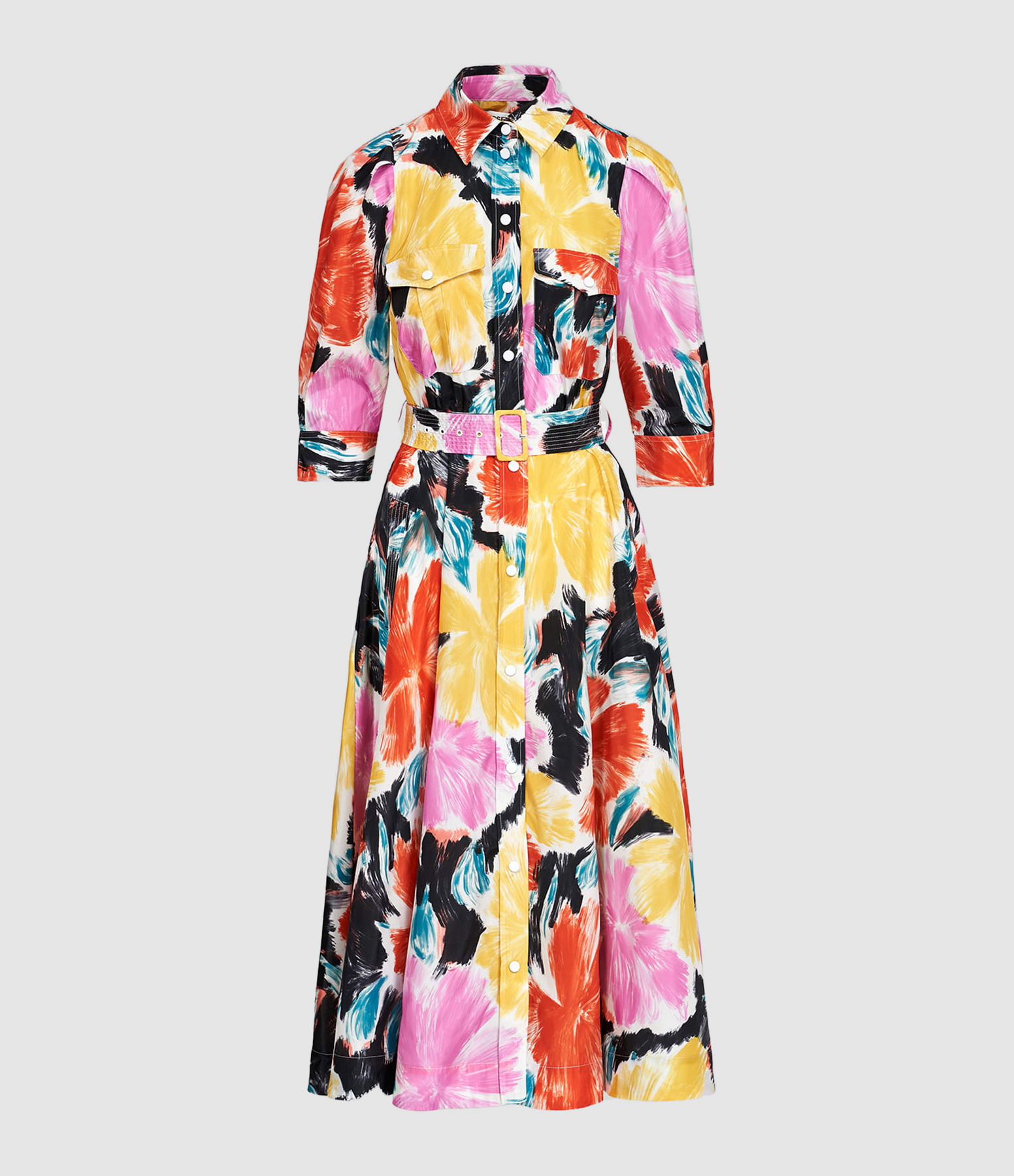 Robe mi-longue imprimé fleuri multicolore. Col chemisier. Fermeture par boutons sur le devant. Manches trois-quarts. Ceinture assortie ajustable à la taille. Deux poches rabats au niveau de la poitrine. Poches latérales. Coupe évasée. Base droite.