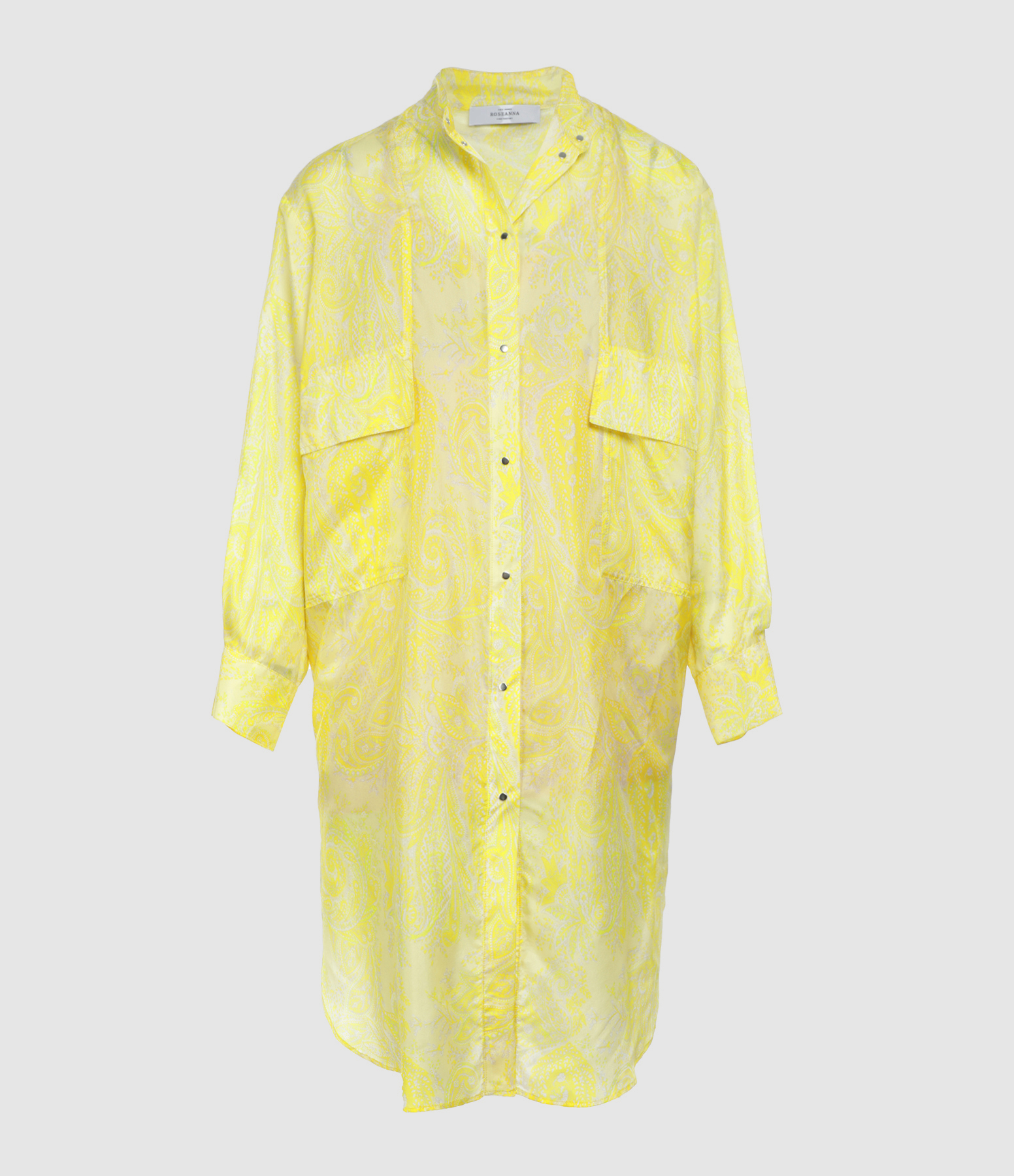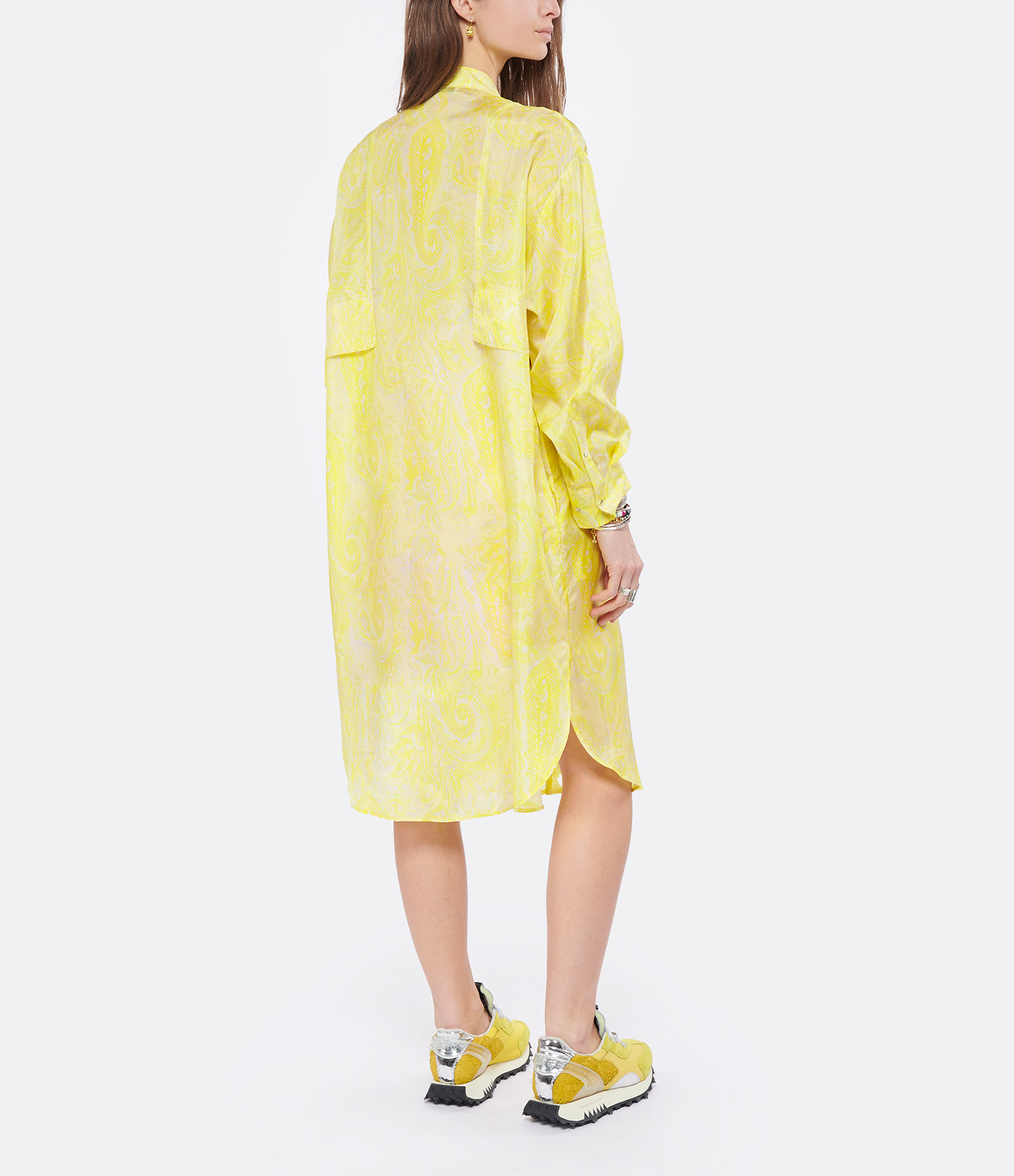 Robe chemise en soie à imprimé jaune. Col mao. Manches longues. Fermeture boutonnée. Deux poches plaquées à rabats sur la poitrine et deux poches fendues. Coupe ample. Base arrondie. Fond de robe inclus.