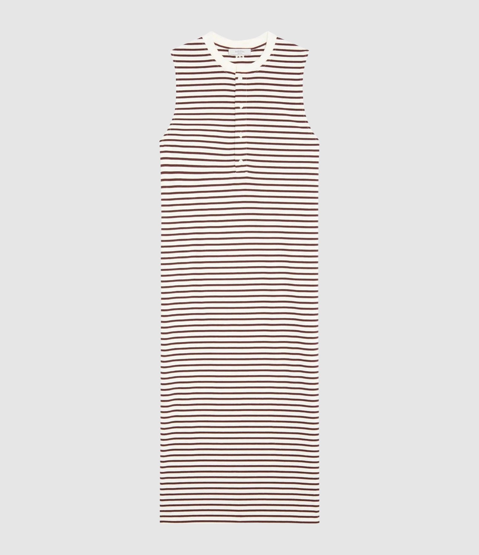 Robe en jersey de coton Roseanna, modèle CLOVER avec motif linéaire. Longue, sans manches, une coupe droite, un col rond avec patte de boutonnage sur le devant et des fentes latérales qui apportent confort et liberté de mouvement.