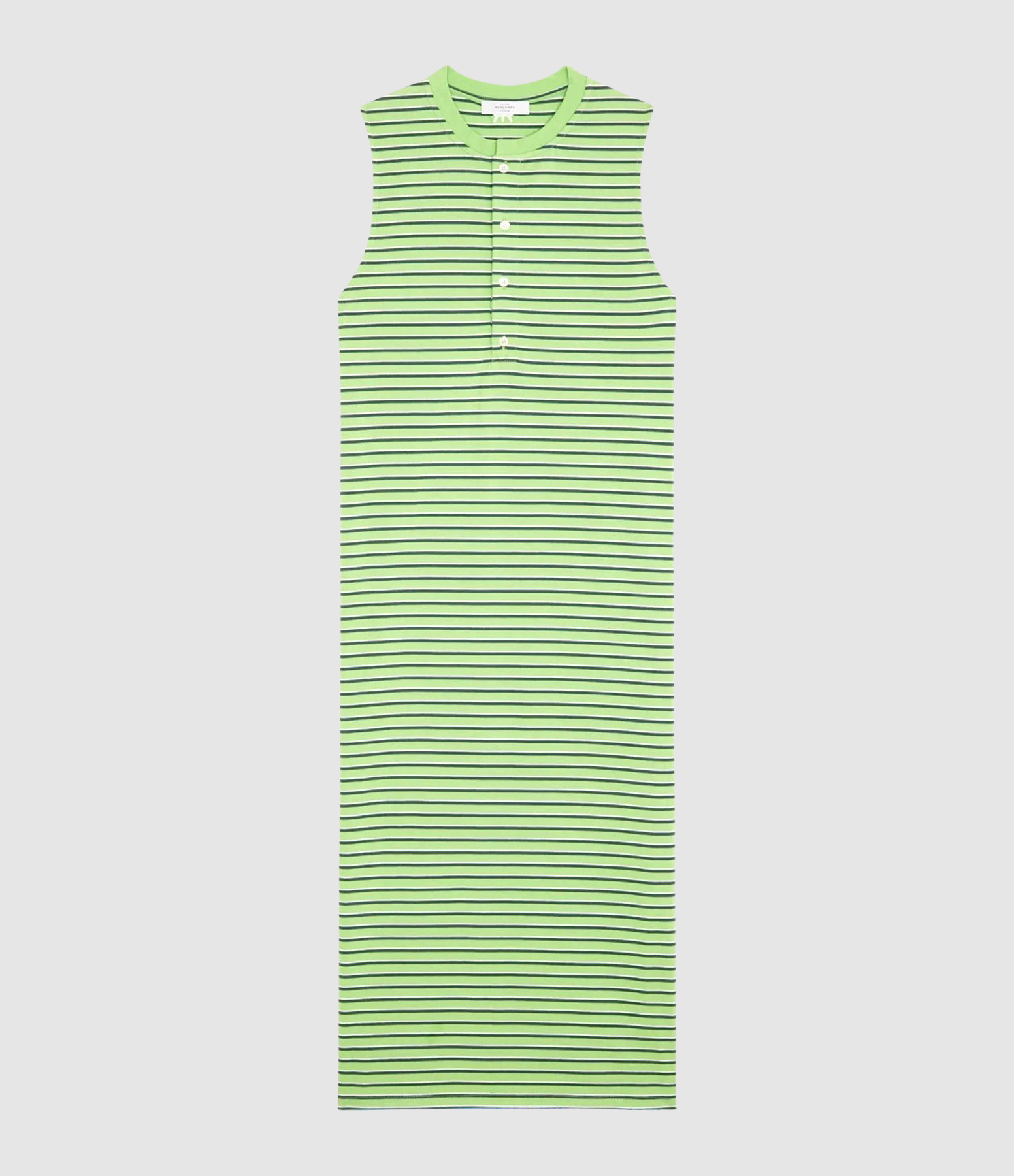 Robe en jersey de coton Roseanna, modèle CLOVER avec motif linéaire. Longue, sans manches, une coupe droite, un col rond avec patte de boutonnage sur le devant et des fentes latérales qui apportent confort et liberté de mouvement.