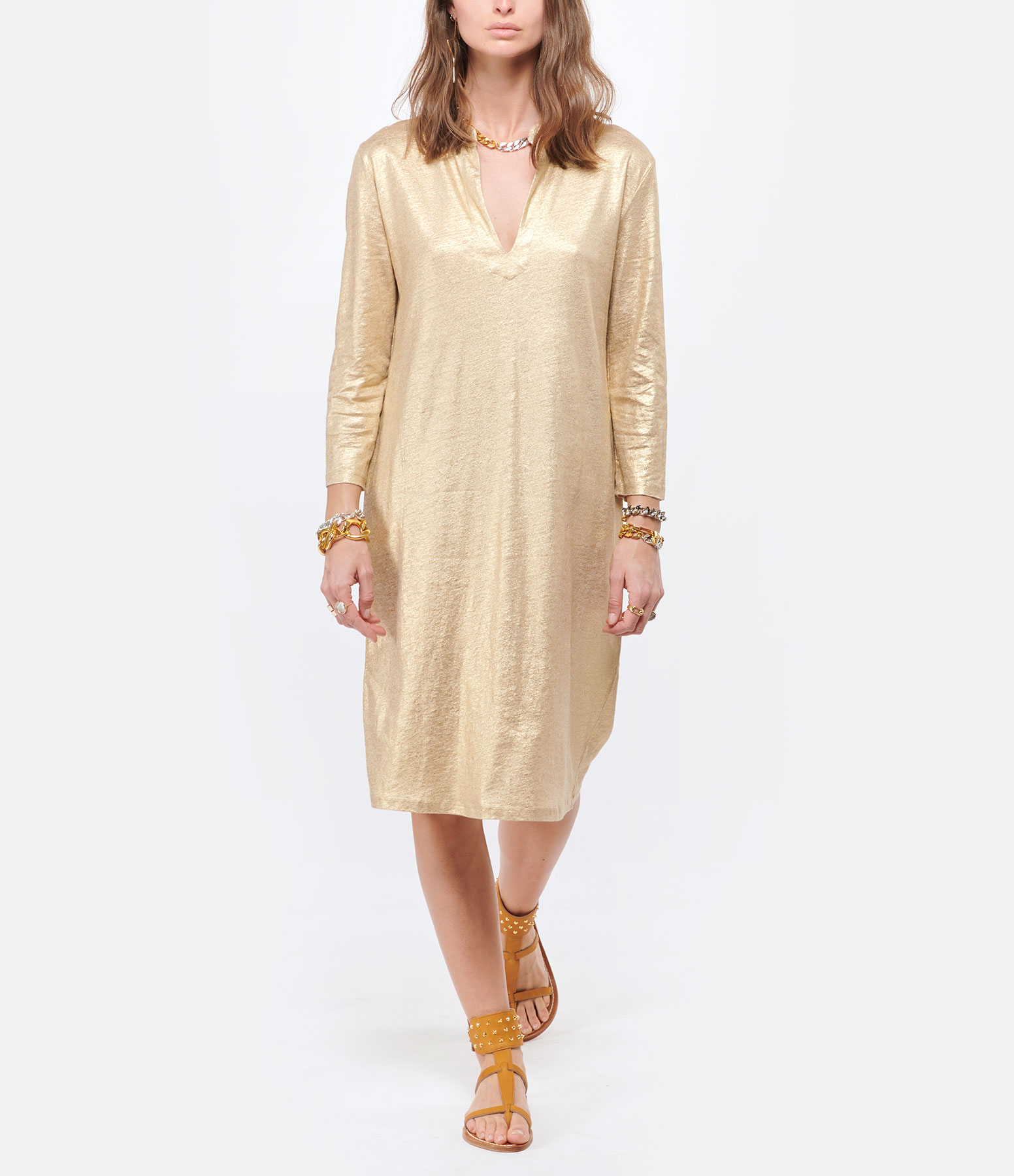 Robe en lin doré. Col tunisien. Manches 3/4. Coupe droite. Base droite. Non doublée.