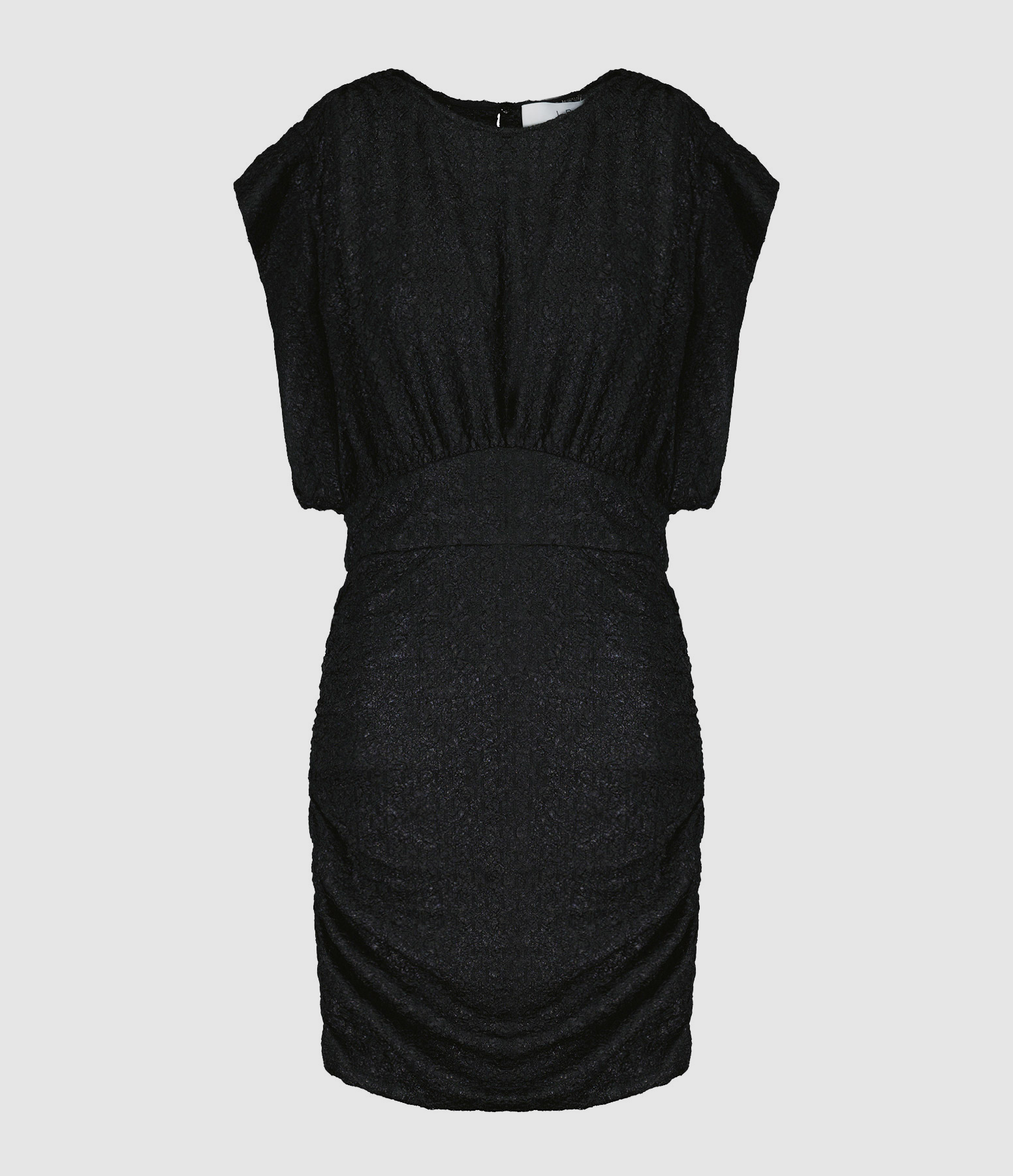 Robe courte noire. Col rond. Plis sur le devant. Emmanchures larges. Fermeture par zip dans le dos. Coupe ajustée. Doublée.