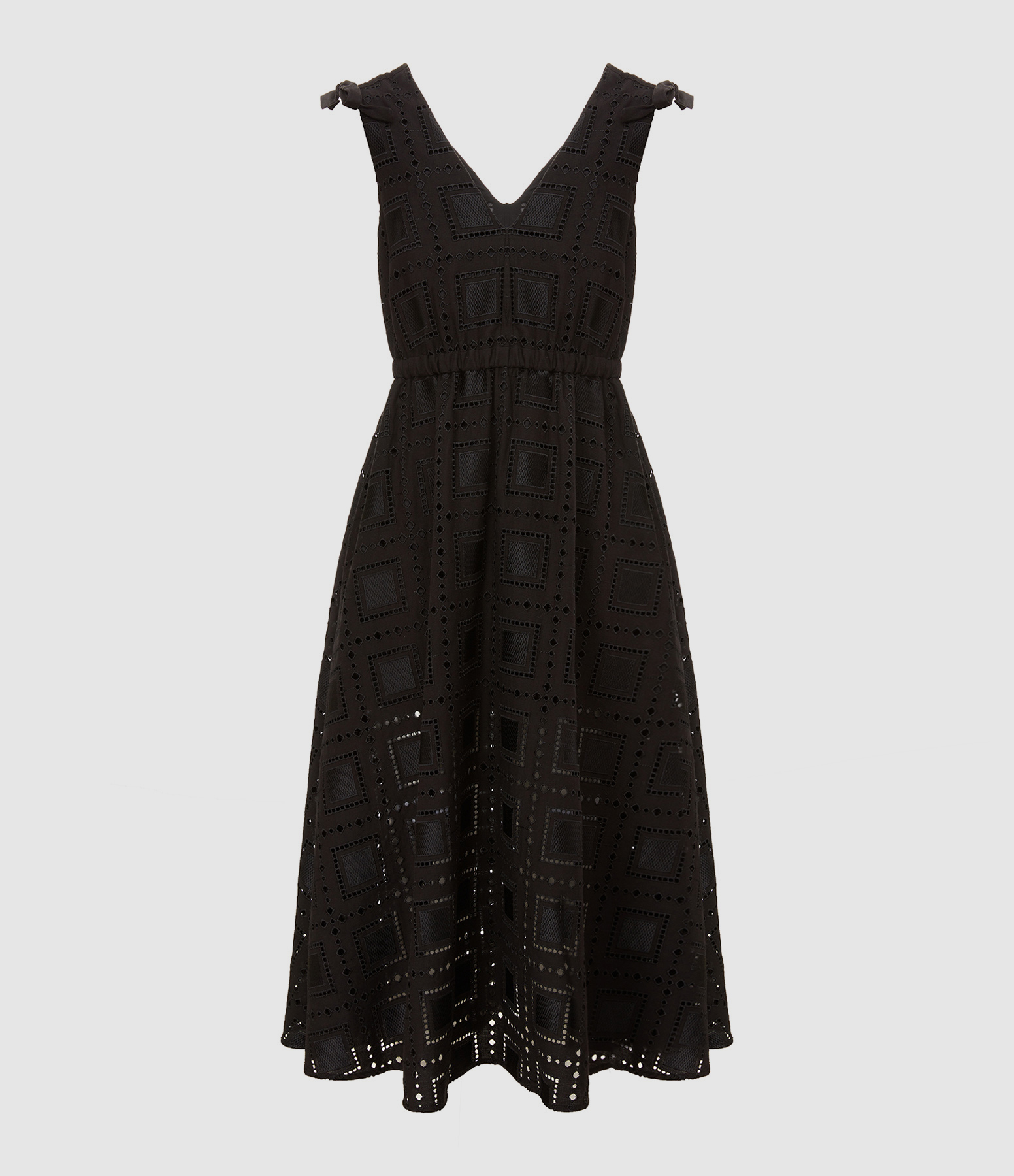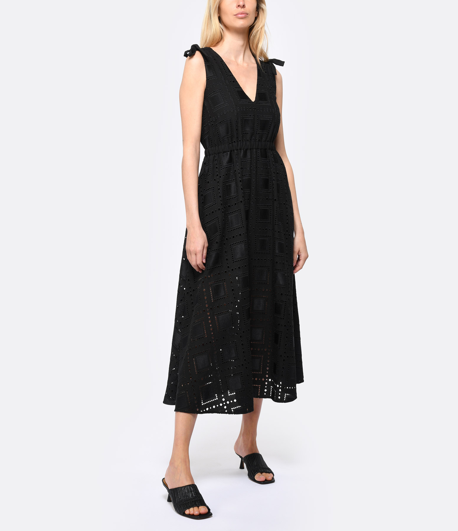 Robe longue noire effet broderie anglaise. Col en V. Sans manches. Froncée à la taille. Coupe droite. Base droite. Doublée.