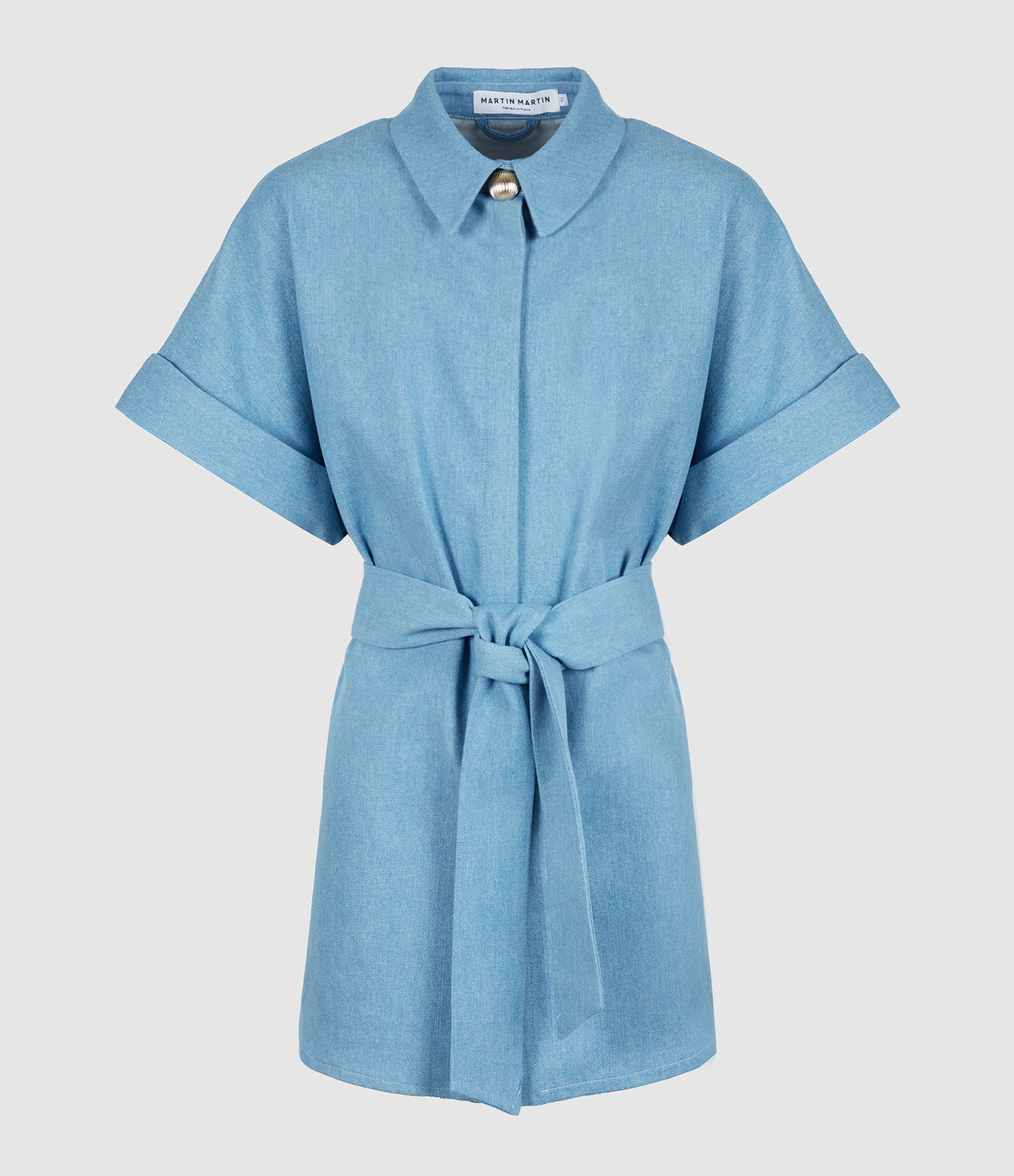 Robe courte en denim de coton bleu. Col chemise avec bouton en or. Fermeture par boutons dissimulés. Manches courtes retroussées. Passants pour ceinture et ceinture amovible. Coupe droite. Base droite.