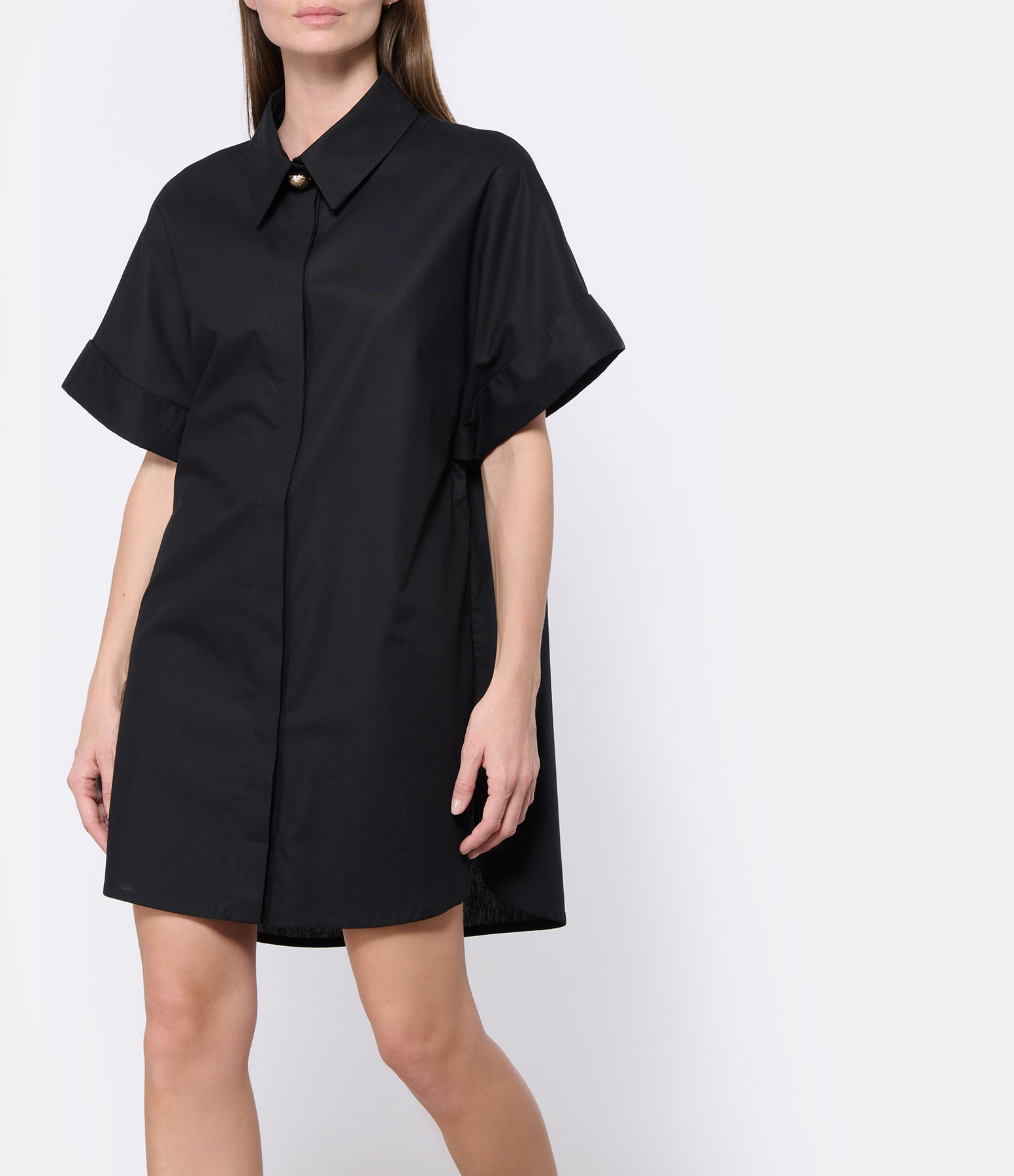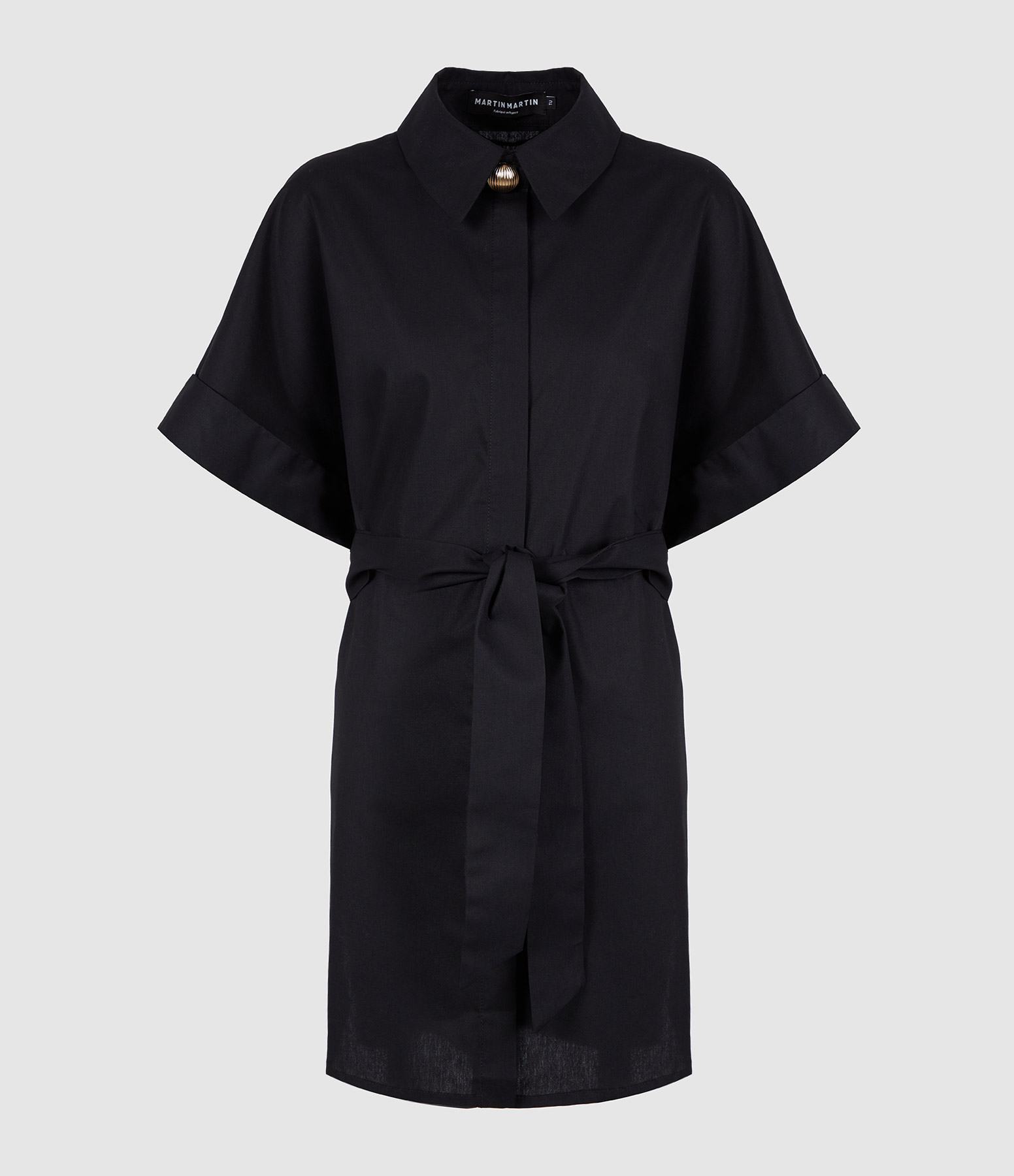Robe courte noire. Col chemise avec bouton en or. Fermeture par boutons dissimulés. Manches courtes retroussées. Passants pour ceinture et ceinture amovible. Coupe droite. Base droite.