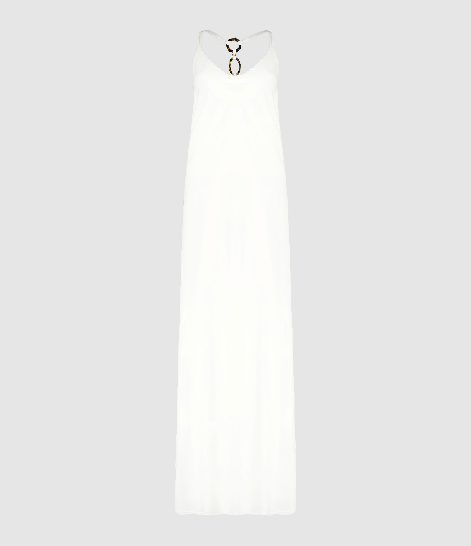Robe longue blanche fluide. Coupe droite. Base droite. Décolleté en V. Bretelles épaules fines en tissu. Bretelle centrale avec anneaux effet écaille de tortue dans le dos.