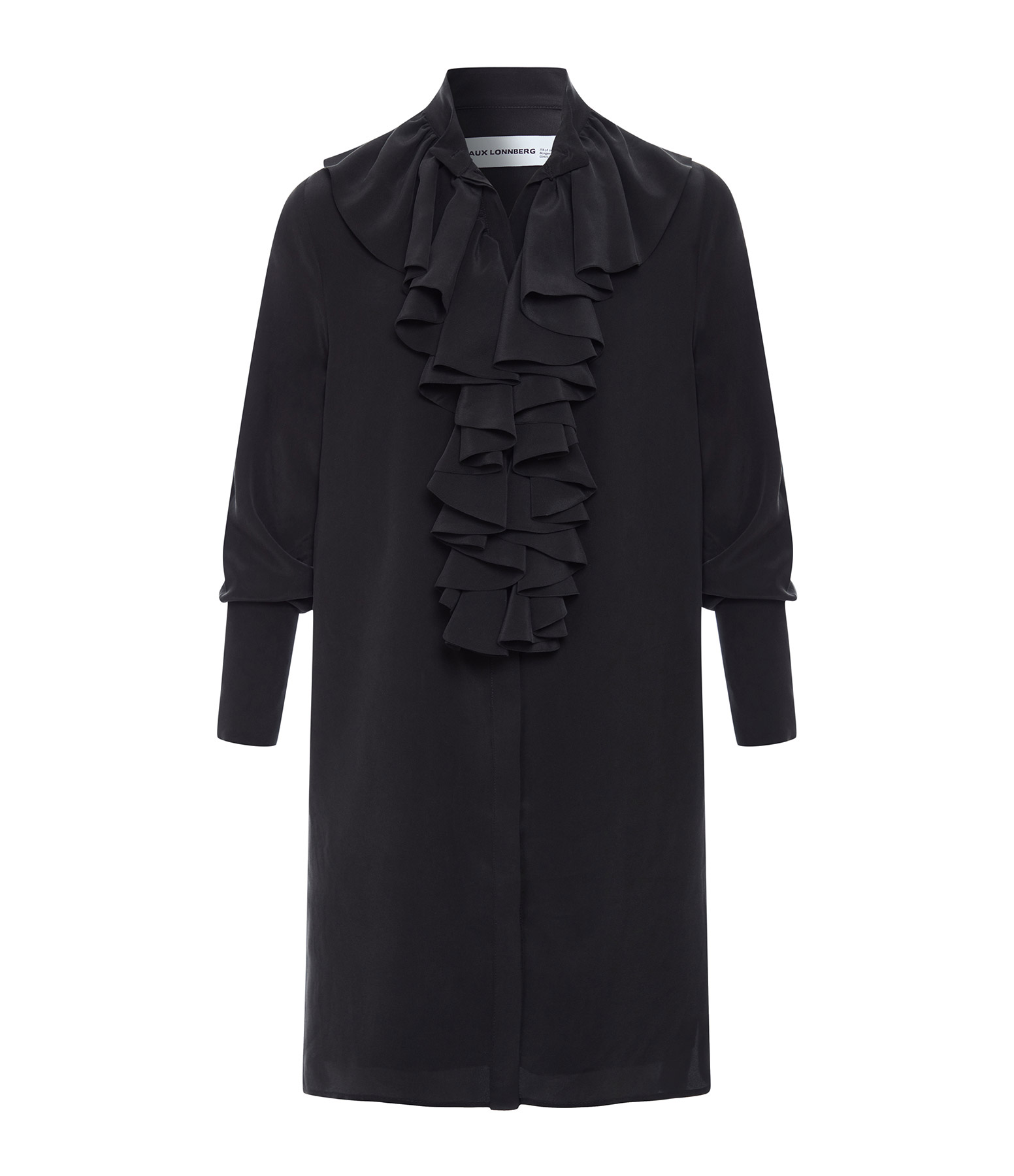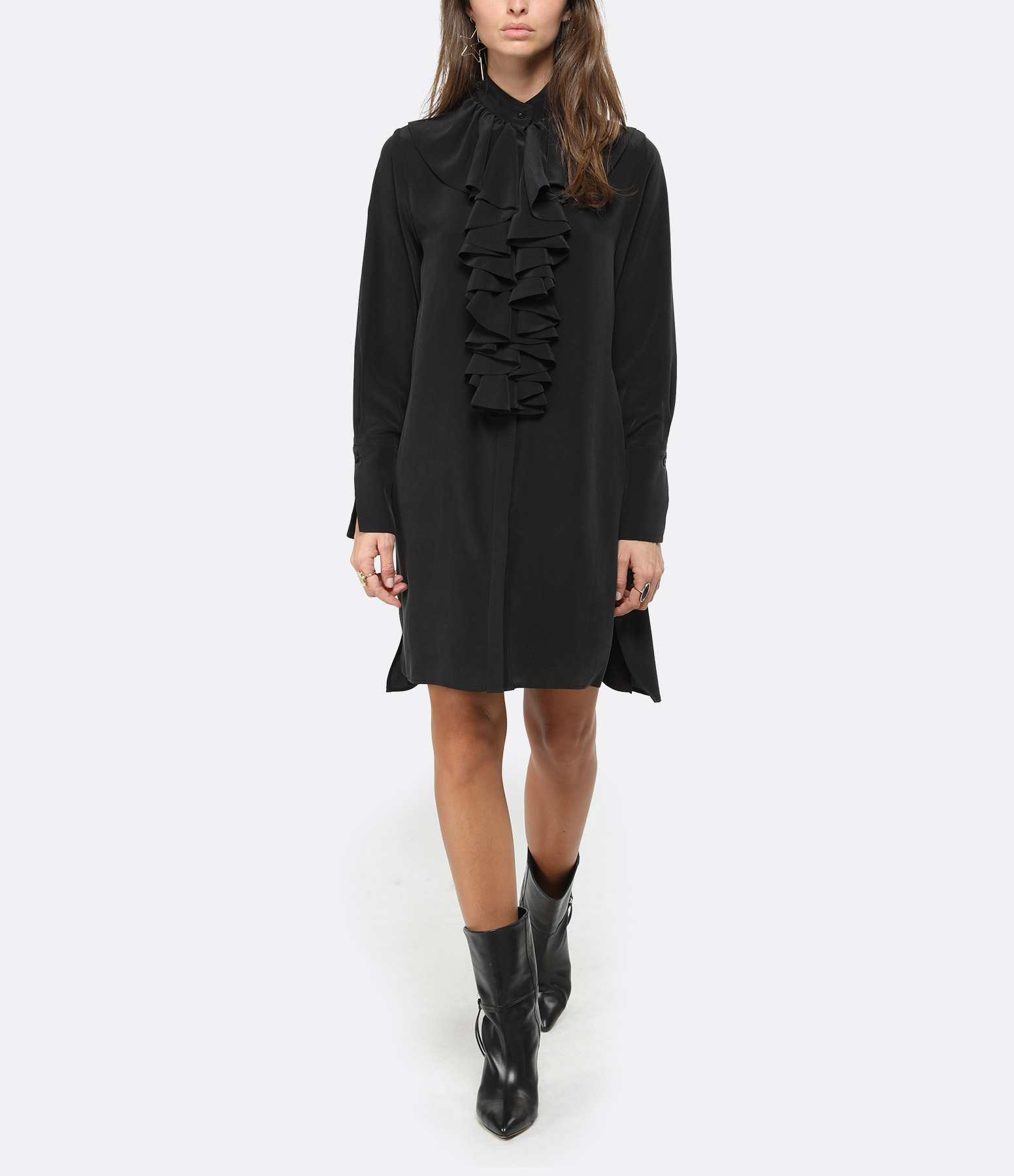 Robe en soie noire. Col rond avec volants. Manches longues. Patte de boutonnage. Coupe droite. Base droite. Doublée.
