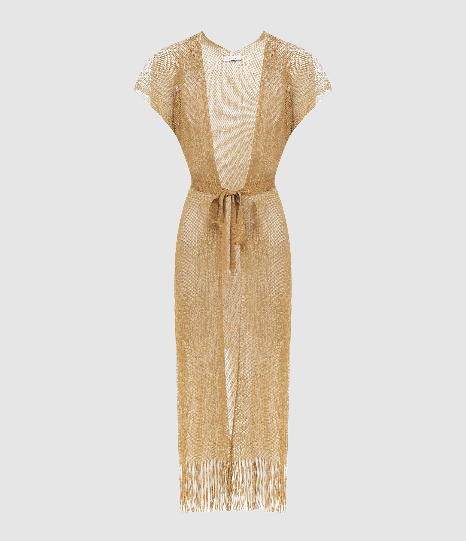Robe de plage longue doré avec fentes latérales et base frangée. Manches courtes. Ceinture intégrée. Non doublé.