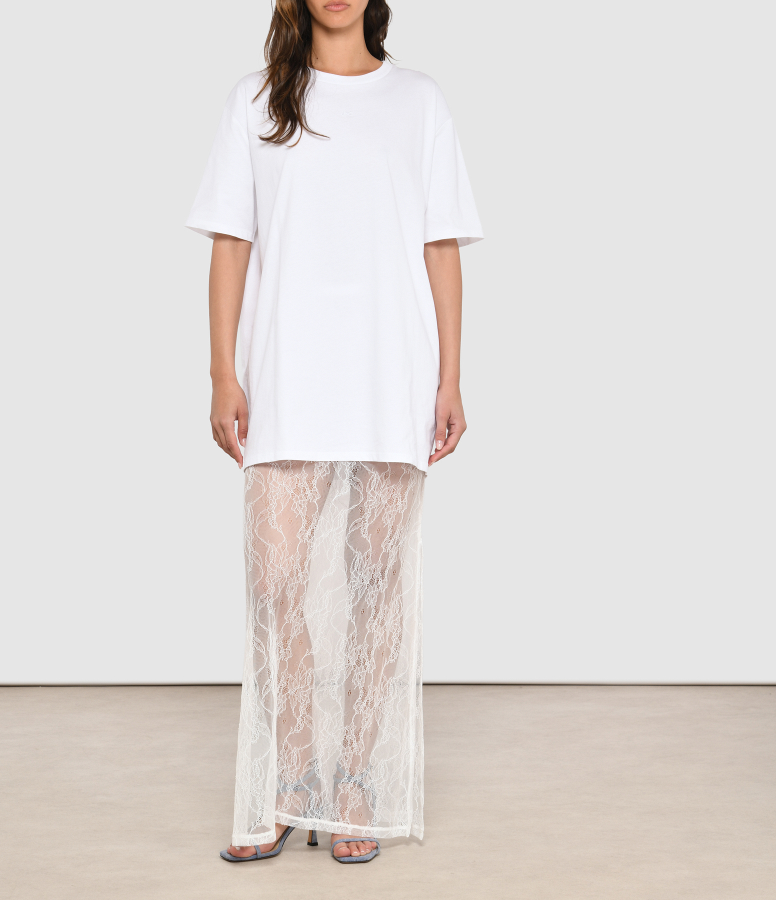 Robe deux-en-un composée d’une jupe en dentelle et d’un t-shirt long. Originale et moderne.